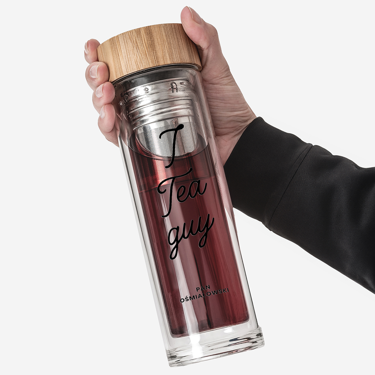 - szklana butelka z zaparzaczem do herbaty ze stali nierdzewnej i z bambusową zakrętką