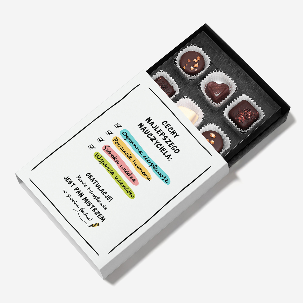 - każda pralinka została wytworzona ręcznie w polskiej manufakturze z belgijskiej czekolady oraz innych składników najwyższej jakości