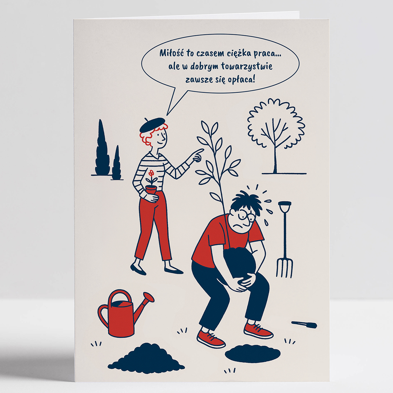 Miłość to czasem ciężka praca, ale z tą kartką świętowanie staje się dużo przyjemniejsze! Kartka na rocznicę ślubu KOMIKS to zabawny drobny prezent dla pary, która ma dystans do siebie i lubi żartobliwe akcenty. Komiksowa ilustracja w lekkim stylu pokazuje codzienność zakochanych z humorem i czułością, tworząc idealną pamiątkę na wspólne lata.