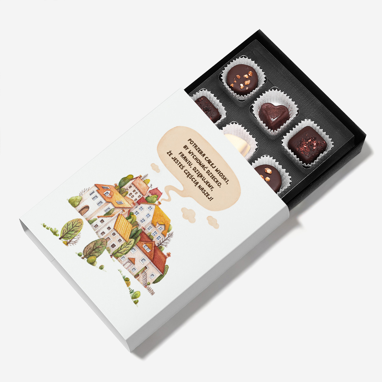 - w komplecie: praliny pakowane w bigowany kartonik z nadrukiem