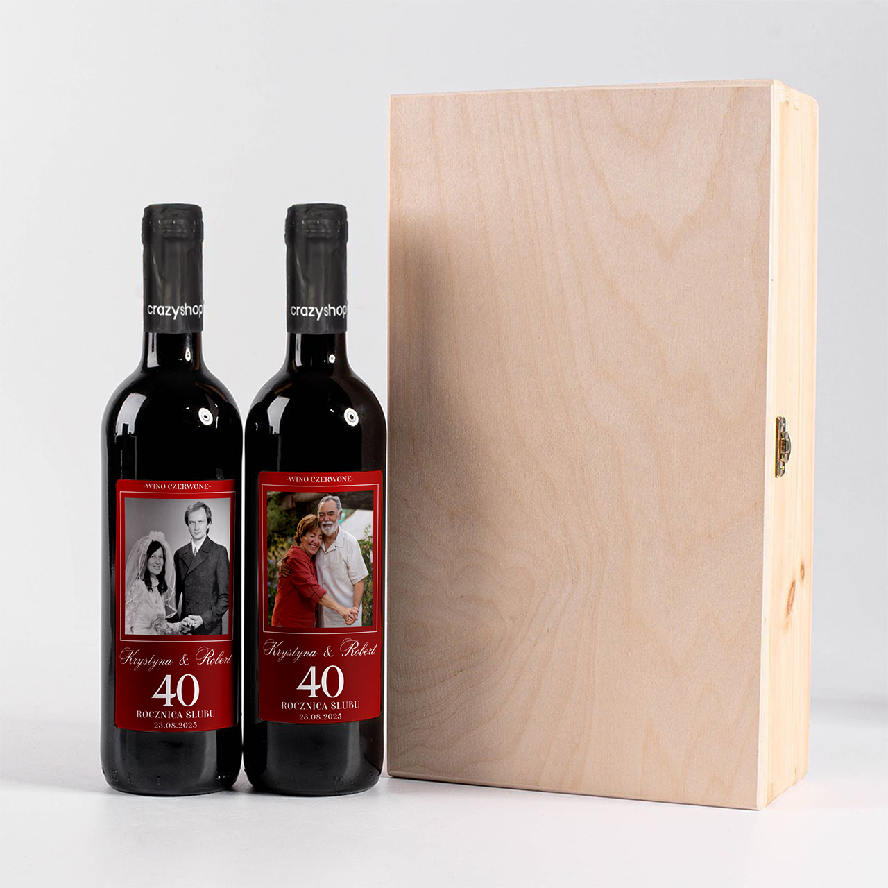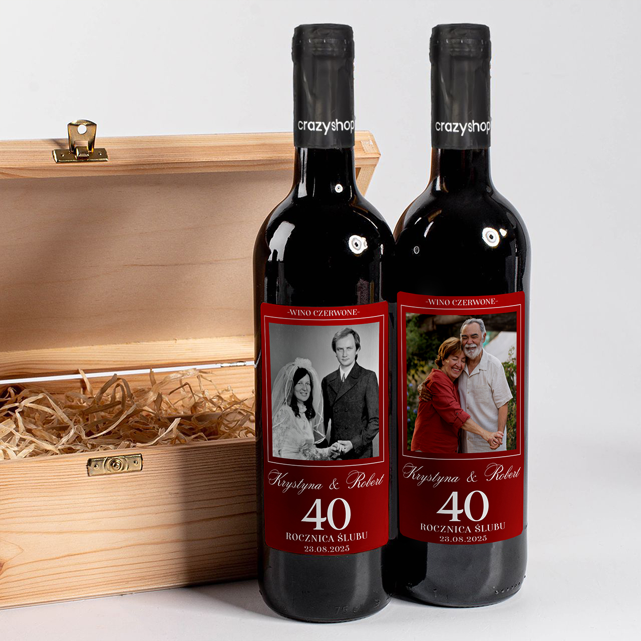 Elegancki i pełen klasy zestaw win w skrzynce to wyjątkowy sposób, by uczcić cztery dekady wspólnego życia. W skrzynce znajdują się dwa personalizowane wina, które symbolizują wspólną drogę pełną smaku, emocji i wspomnień. Każda etykieta może zawierać imiona, datę ślubu i osobistą dedykację. To pamiątka, która zostanie z obdarowanymi na długo po opróżnieniu butelki.