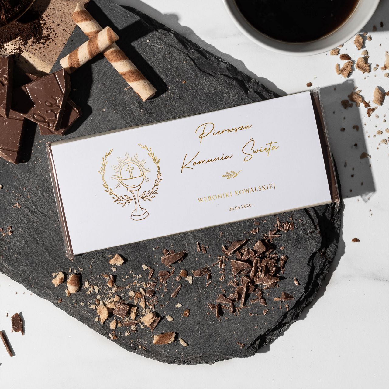 Elegancka czekolada na komunię ZE ZŁOCENIEM to wyjątkowy i pyszny prezent komunijny, który zachwyci zarówno smakiem, jak i wyglądem. Ręcznie przygotowana tabliczka czekolady, ozdobiona subtelnym, złotym napisem i motywem kielicha, prezentuje się niezwykle stylowo i delikatnie. To idealny prezent dla dziecka na komunię - połączenie elegancji, symboliki i słodkiej przyjemności w jednym. Doskonała zarówno jako dodatek do większego upominku, jak i samodzielny, gustowny gest.