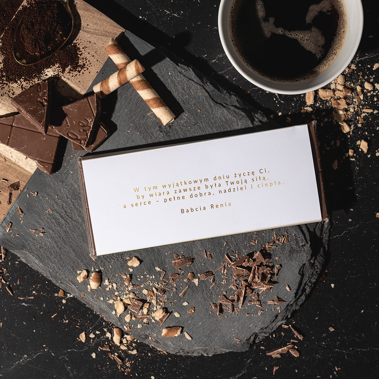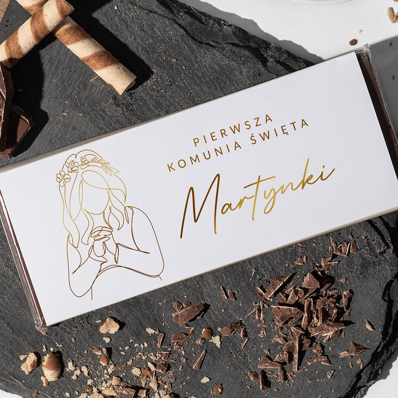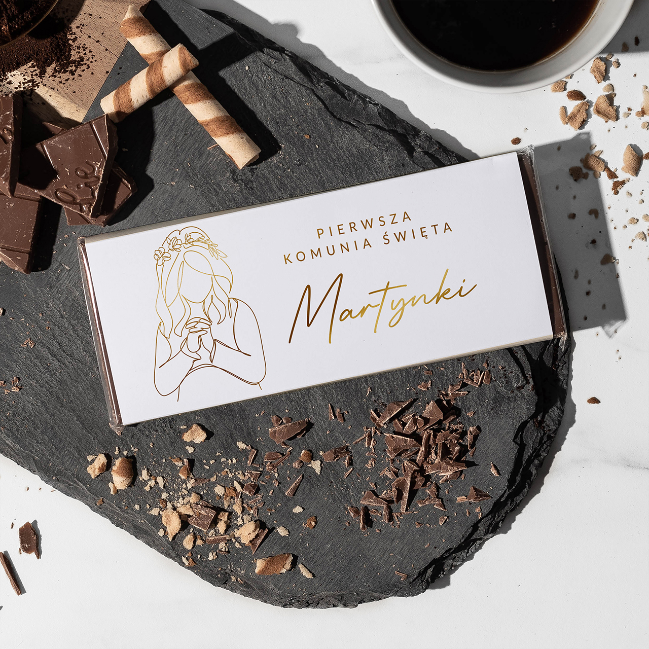Delikatna i elegancka personalizowana CZEKOLADA NA KOMUNIĘ to idealny pomysł na wyjątkowy upominek, który podkreśli wyjątkowość tego dnia. Zapakowana w minimalistyczne, białe opakowanie ze złotym nadrukiem, prezentuje się niezwykle gustownie i odświętnie. Możliwość personalizacji sprawia, że każda czekolada personalizowana staje się niepowtarzalną pamiątką tego ważnego dnia. To doskonały sposób, aby w słodki i symboliczny sposób uczcić Pierwszą Komunię Świętą.