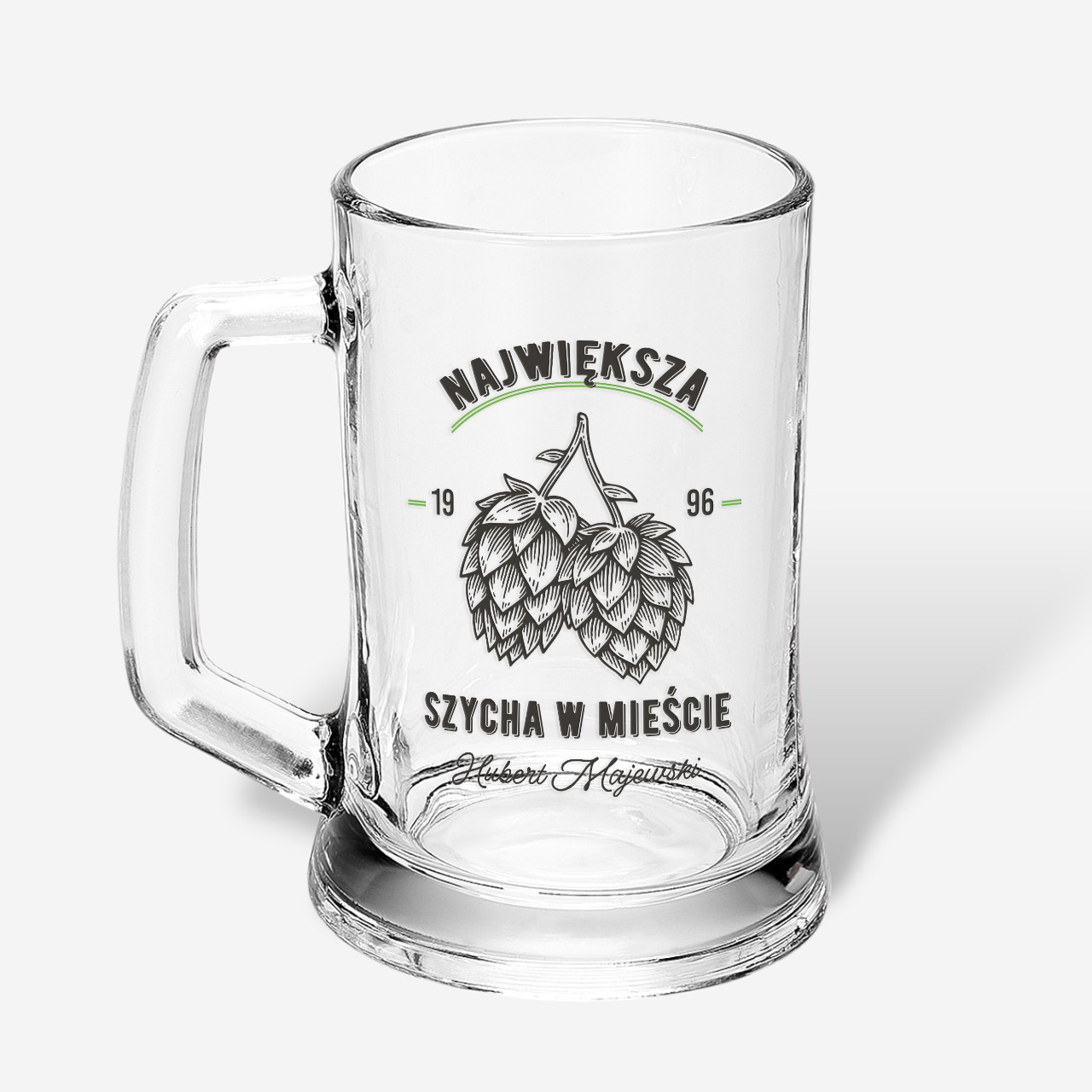 Stylowy i solidny personalizowany kufel do piwa dla mężczyzny SZYCHA to wyjątkowy pomysł na prezent dla faceta, który lubi relaks przy złotym trunku. Oryginalny nadruk z napisem "Największa szycha w mieście" i możliwością dodania imienia sprawia, że kufel staje się osobistym, zabawnym i praktycznym upominkiem. Wykonany z grubego szkła, idealnie leży w dłoni i świetnie prezentuje się podczas spotkań w gronie znajomych.