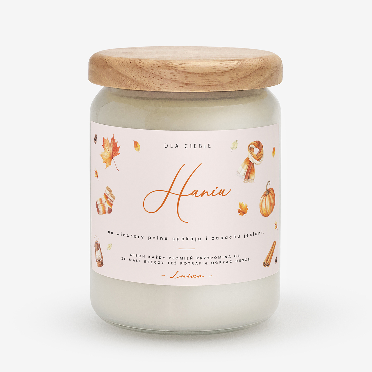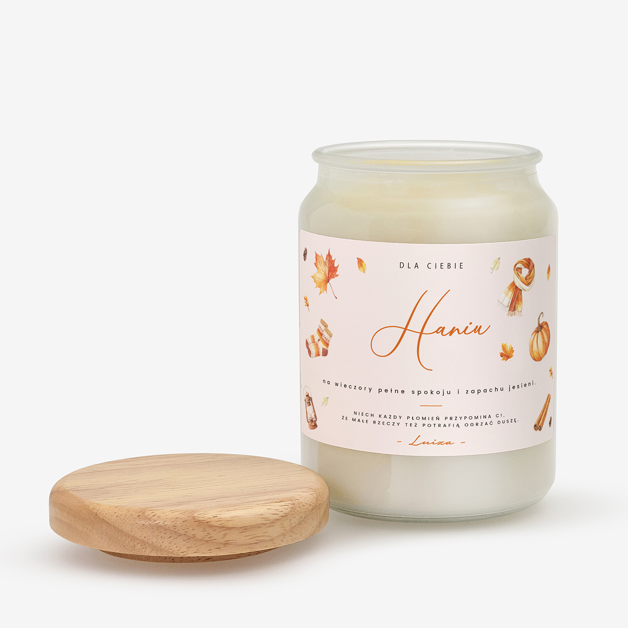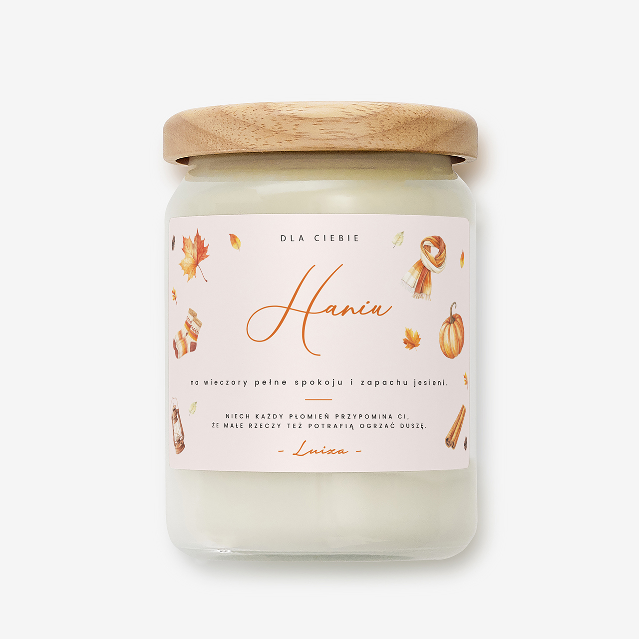 Personalizowana świeca sojowa to idealny wybór dla osób, które kochają jesień i jej wyjątkowy klimat. Naturalna świeca z napisem w szklanym słoiku z drewnianym wieczkiem wprowadzi do domu miękkie światło i aromatyczną harmonię. To nie tylko dekoracja, ale też wyjątkowy symbol relaksu i wdzięczności za małe przyjemności. To prezent, który ogrzeje duszę i zachwyci każdego, kto kocha jesienny nastrój.