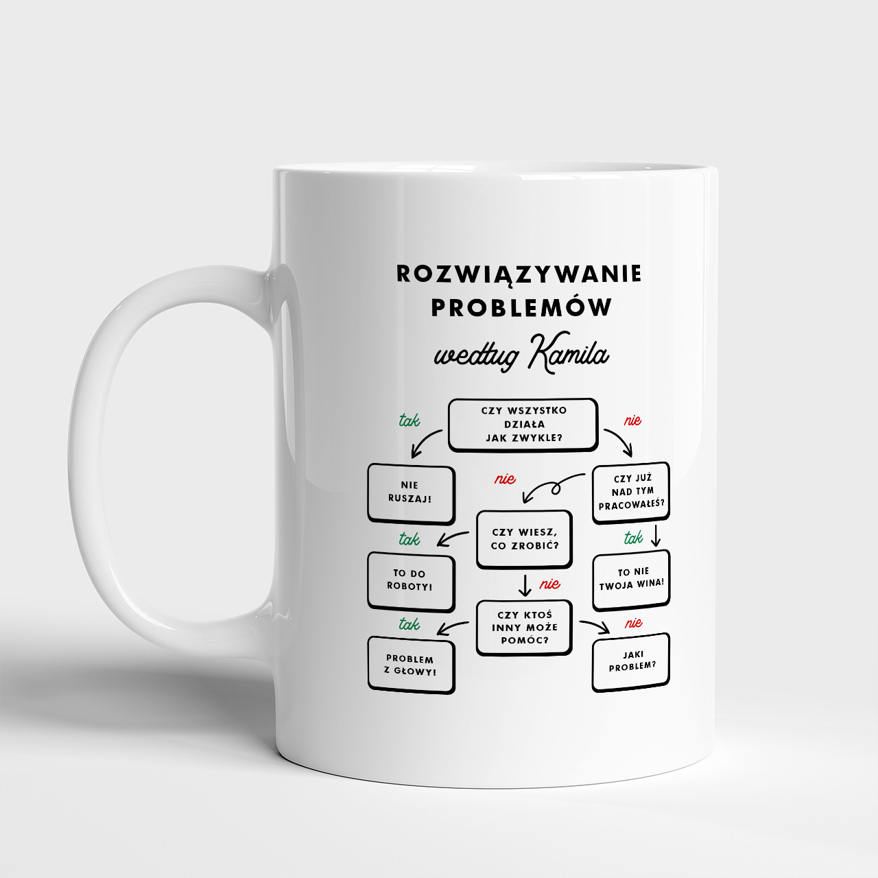 Śmieszny kubek dla kolegi z pracy na święta to prezent, który gwarantuje uśmiech już przy pierwszym łyku kawy. Zabawny nadruk z diagramem doskonale oddaje biurową rzeczywistość i trafi w gust każdego, kto lubi żarty z codziennych wyzwań w pracy. To praktyczny i dowcipny prezent świąteczny, który z pewnością umili poranki w biurze i rozluźni atmosferę między współpracownikami.