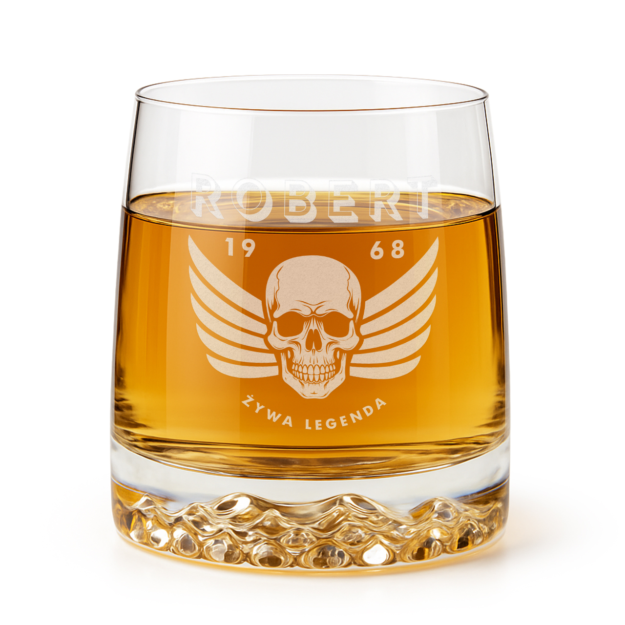 Grawerowana szklanka do whisky to stylowy i charakterystyczny upominek, który świetnie oddaje ducha wolności i pasję do dwóch kółek. Produkt wyróżnia się masywnym dnem, przejrzystym szkłem oraz odważnym grawerem z motywem czaszki i skrzydeł, dzięki czemu idealnie trafia w gust miłośników motocykli. Szklanka doskonale sprawdza się podczas degustacji ulubionej whisky, stając się jednocześnie wyrazistą dekoracją domowego barku. To prezent, który łączy funkcjonalność z mocnym, wyrazistym stylem.