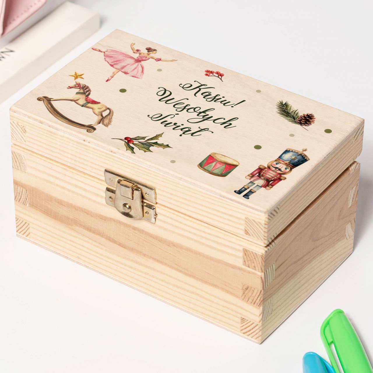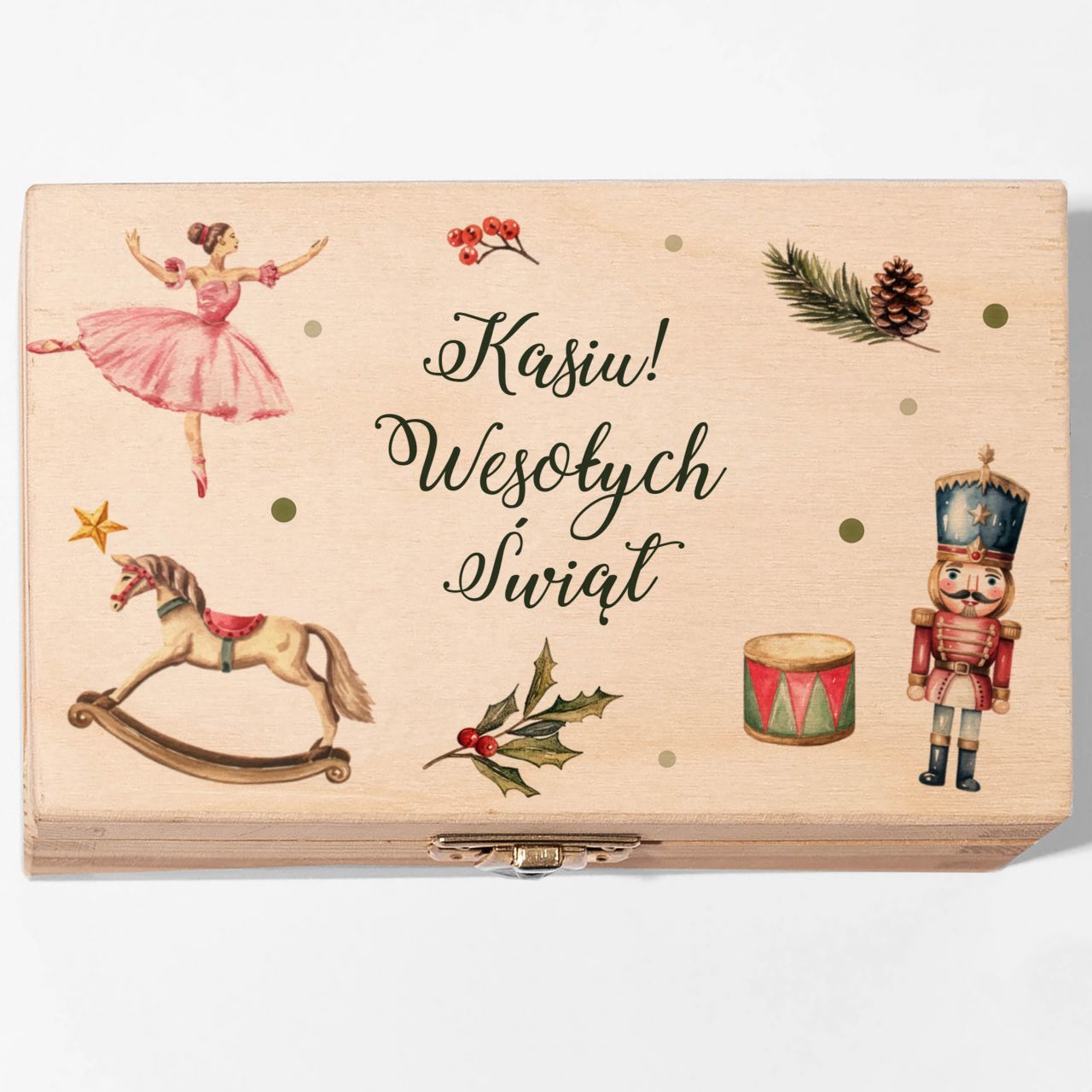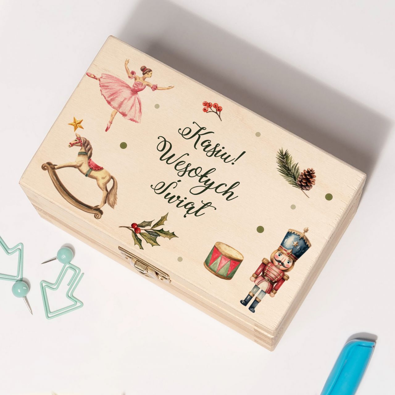 Szkatułka świąteczna dla dziecka DZIADEK DO ORZECHÓW to wyjątkowa pamiątka, która tworzy magiczny klimat już od pierwszego spojrzenia. Drewniana skrzyneczka ozdobiona ilustracjami inspirowanymi klasyczną bajką pozwala dziecku ukryć w środku swoje małe skarby, listy, wspomnienia lub świąteczne drobiazgi. To piękny prezent dla dziecka, który łączy świąteczne wzruszenia z możliwością przechowywania najważniejszych drobnostek.
