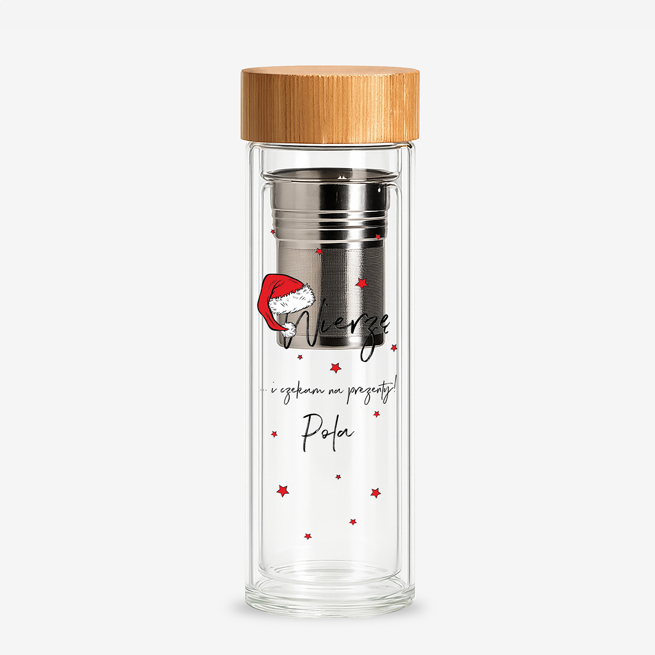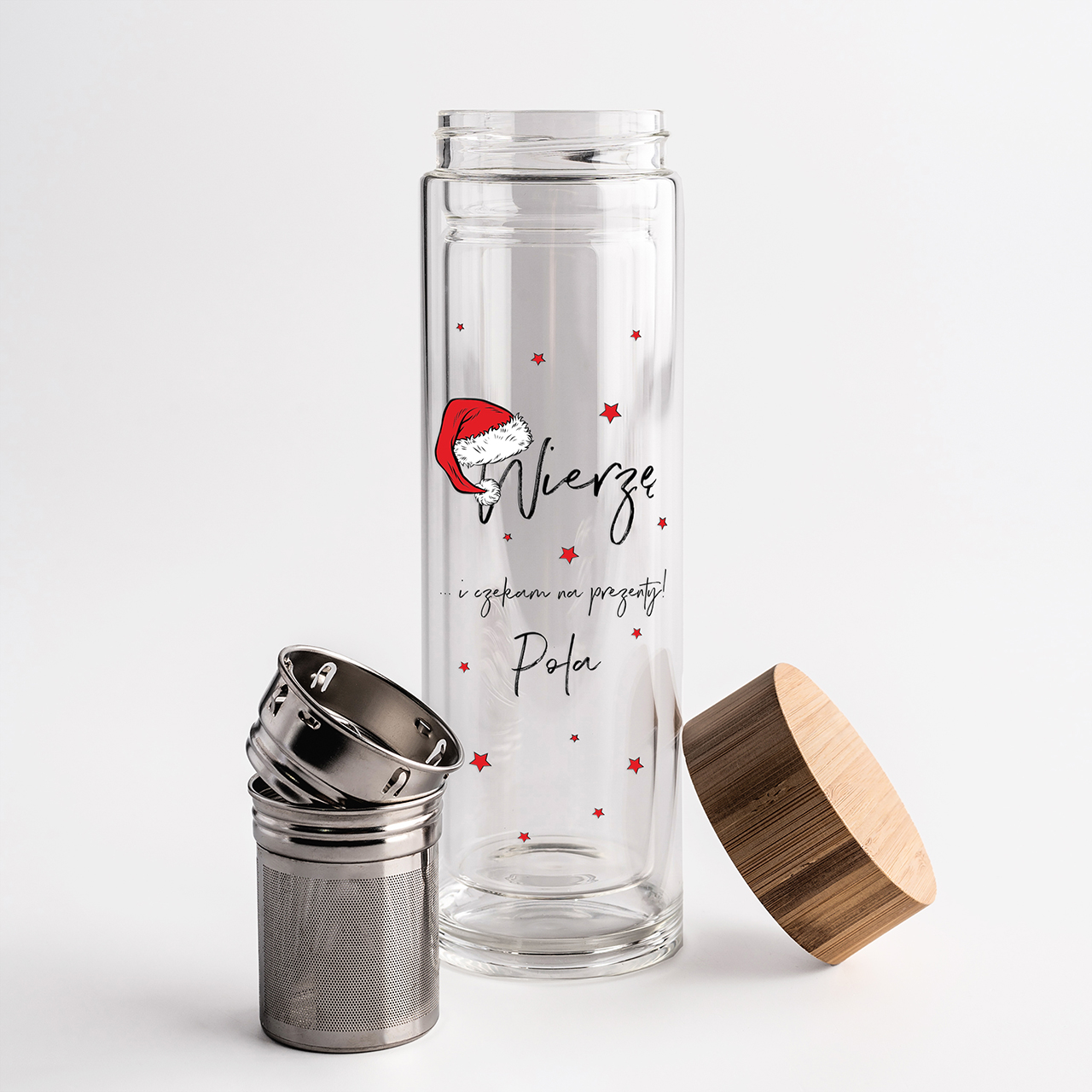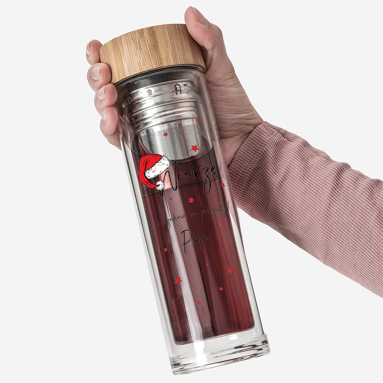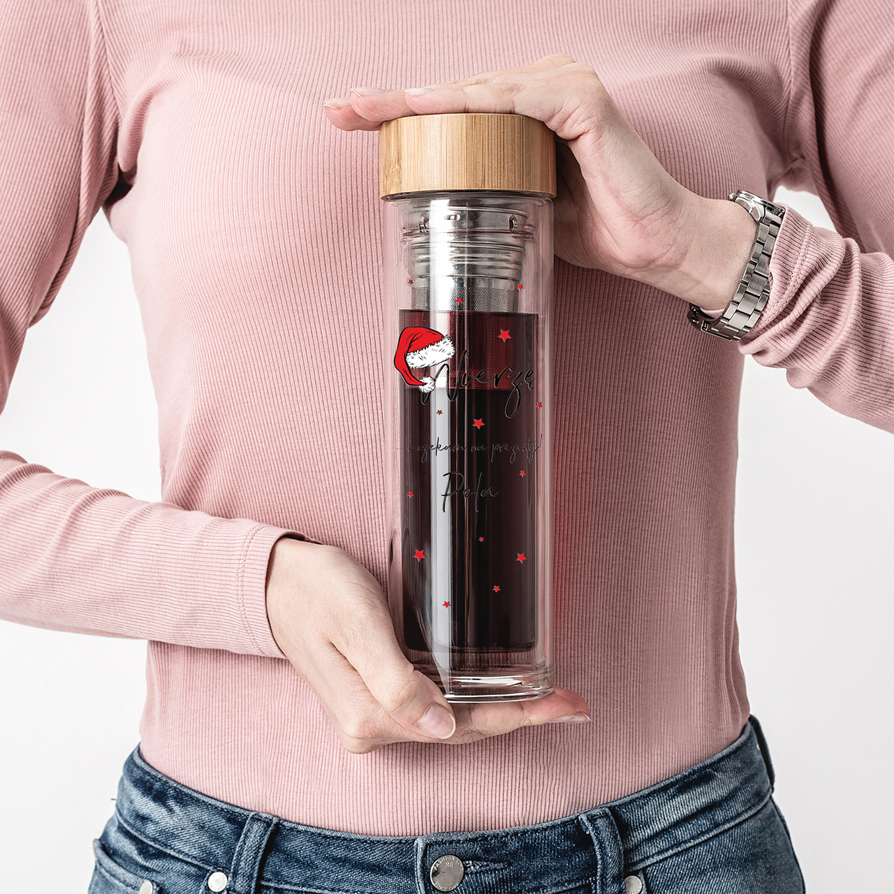 - szklana butelka z zaparzaczem do herbaty ze stali nierdzewnej i z bambusową zakrętką