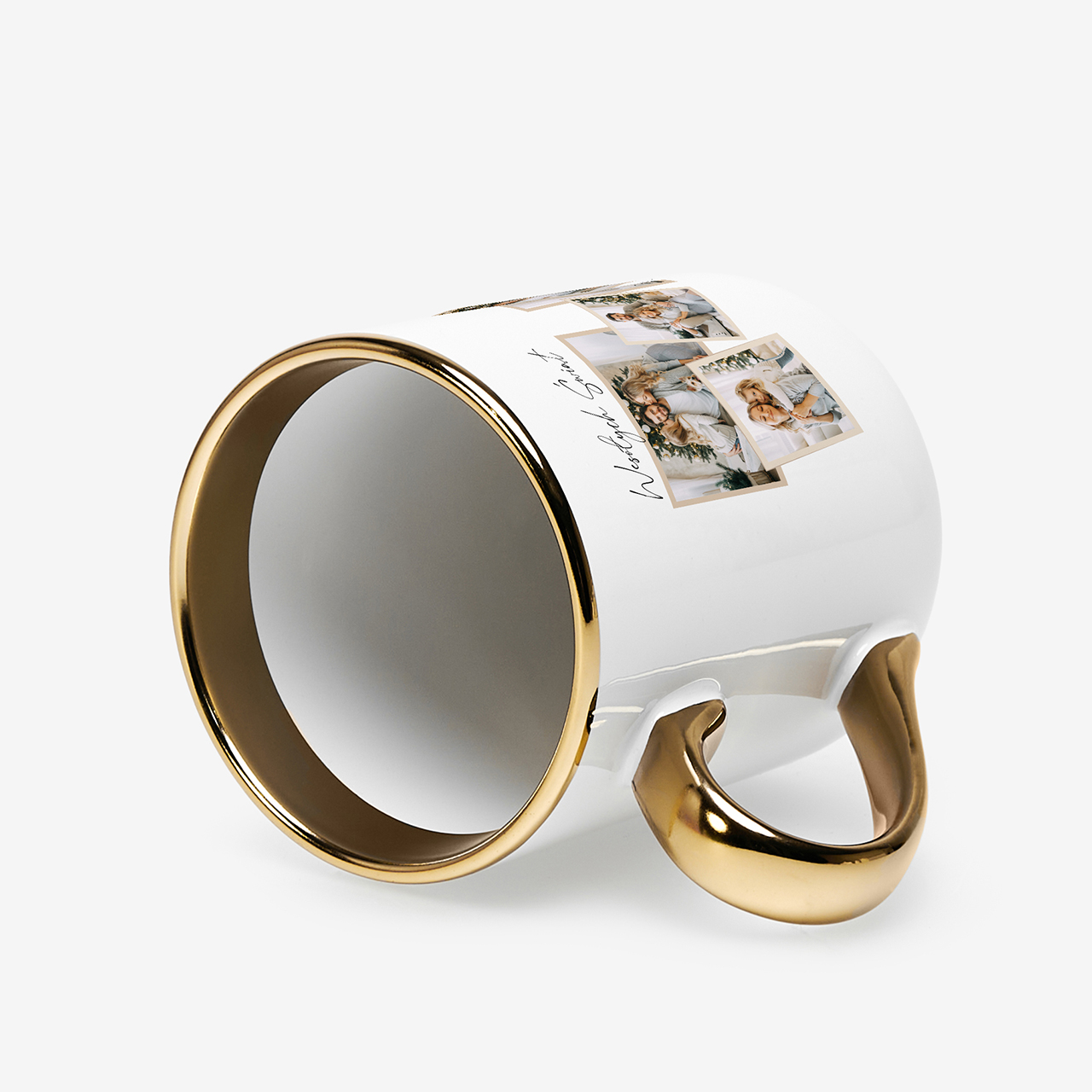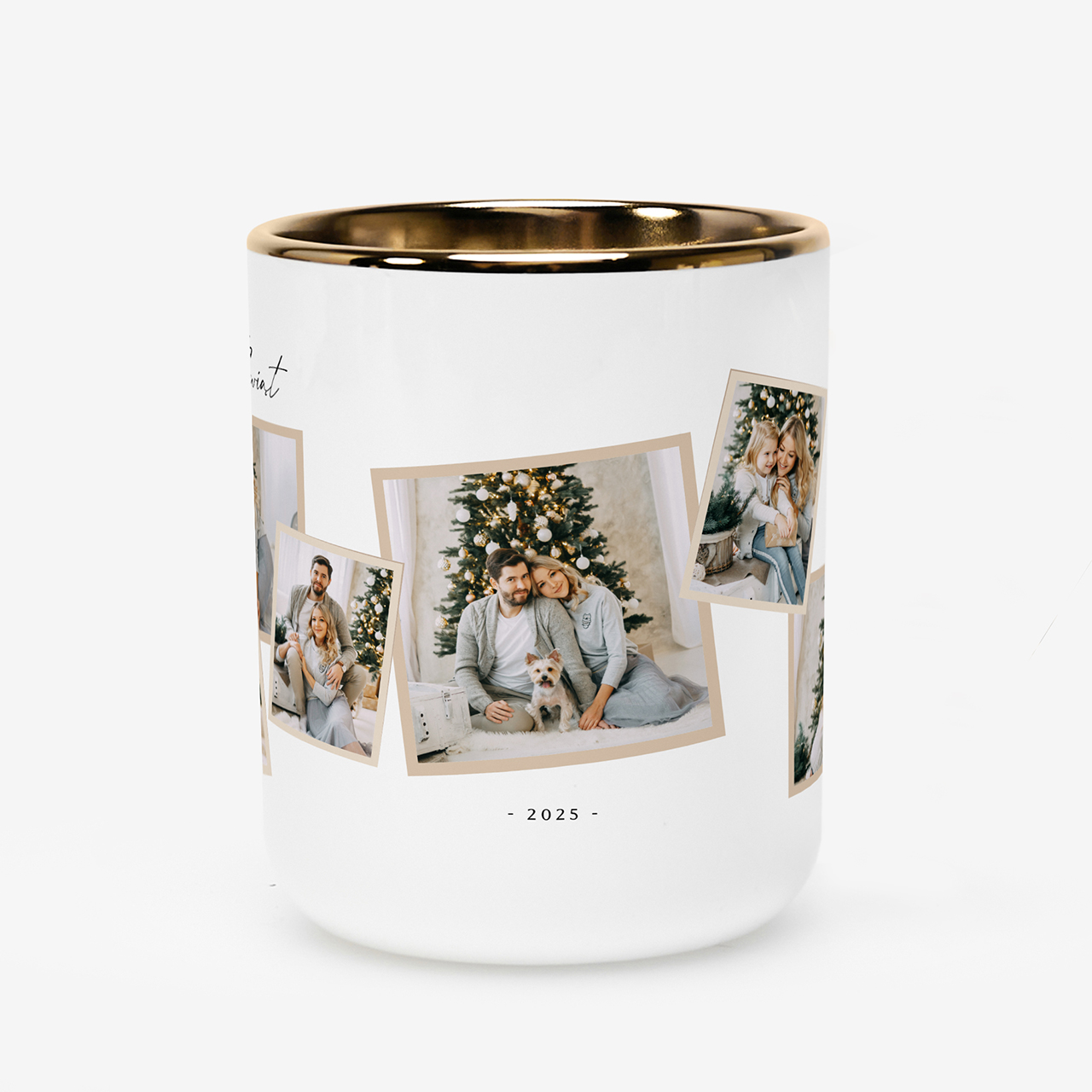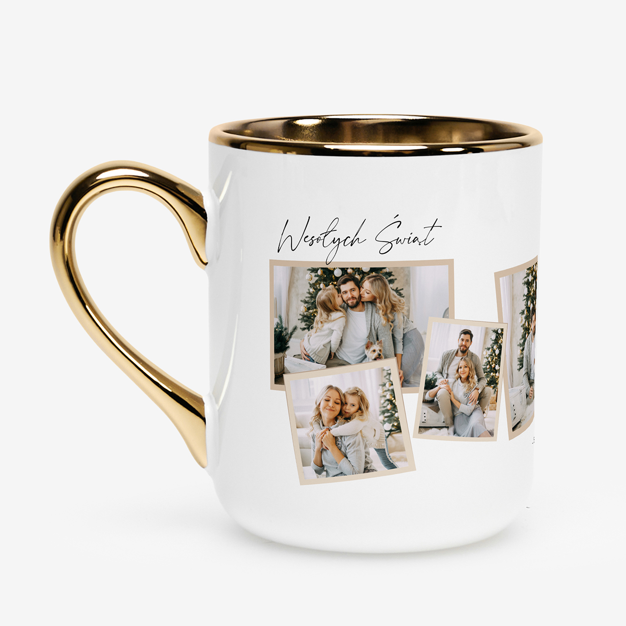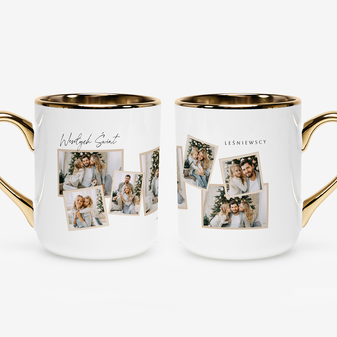 Elegancki kubek na święta RODZINNY KOLAŻ to wyjątkowy sposób, by zatrzymać świąteczne wspomnienia w codziennym użytku. Ten kubek świąteczny zachwyca złotym wykończeniem oraz ciepłym, rodzinnym charakterem. Idealnie sprawdzi się jako prezent na święta dla rodziny, bo pozwala umieścić kilka zdjęć, które tworzą piękny, emocjonalny kolaż.