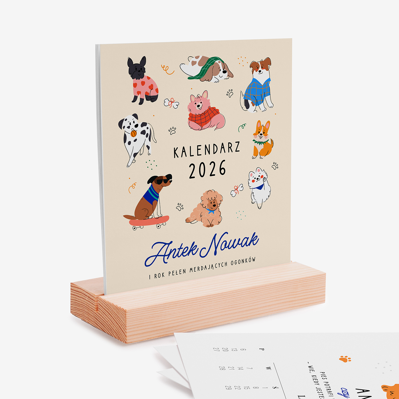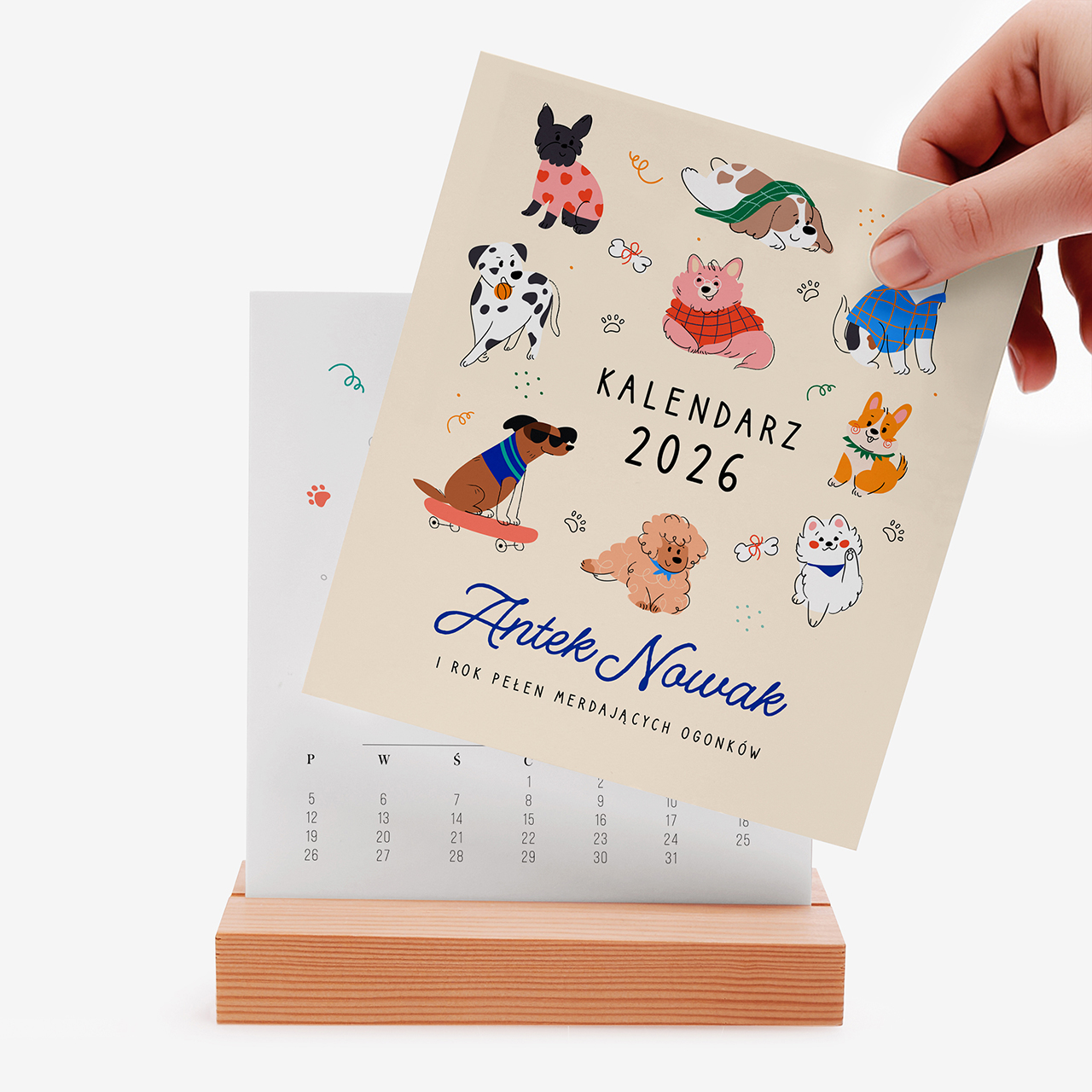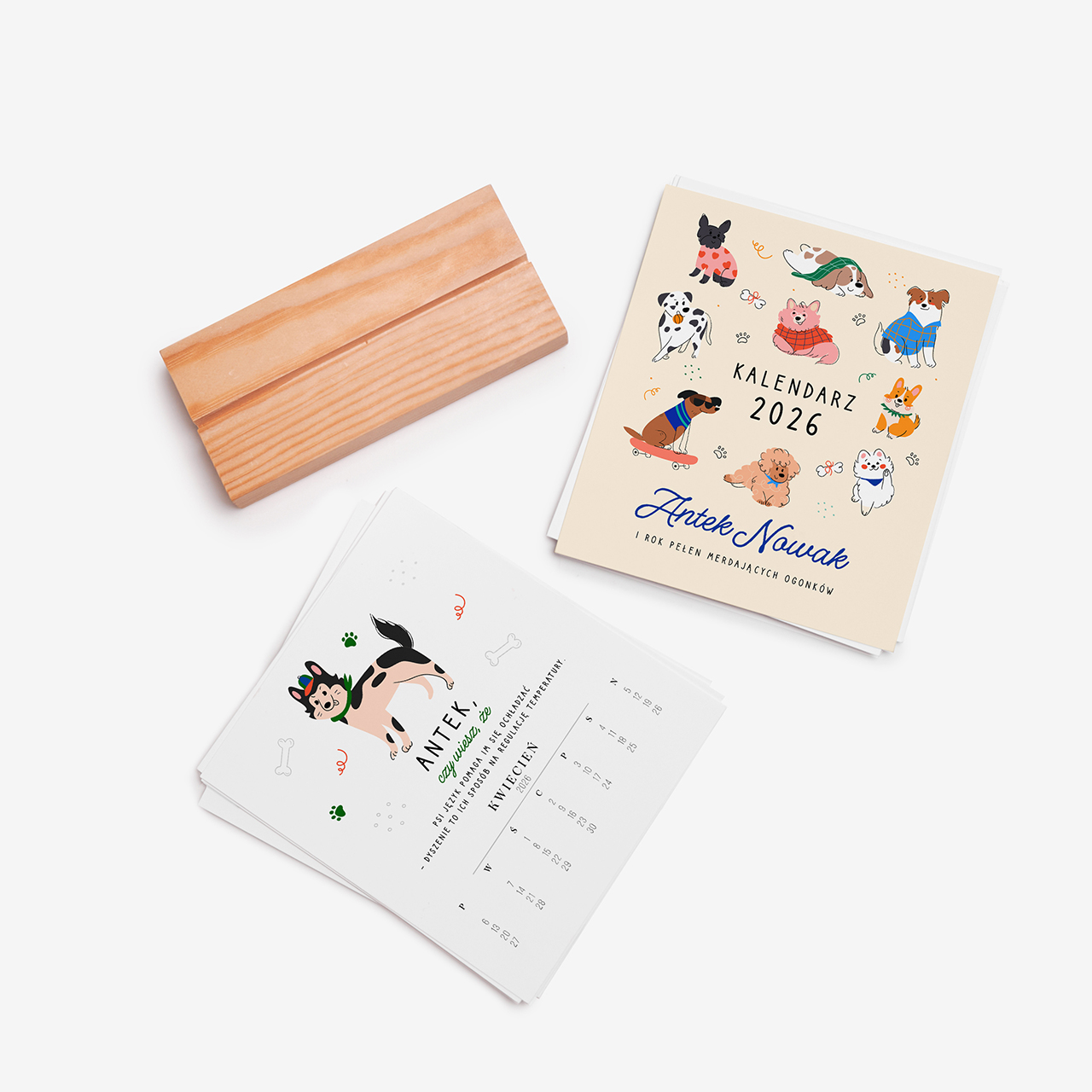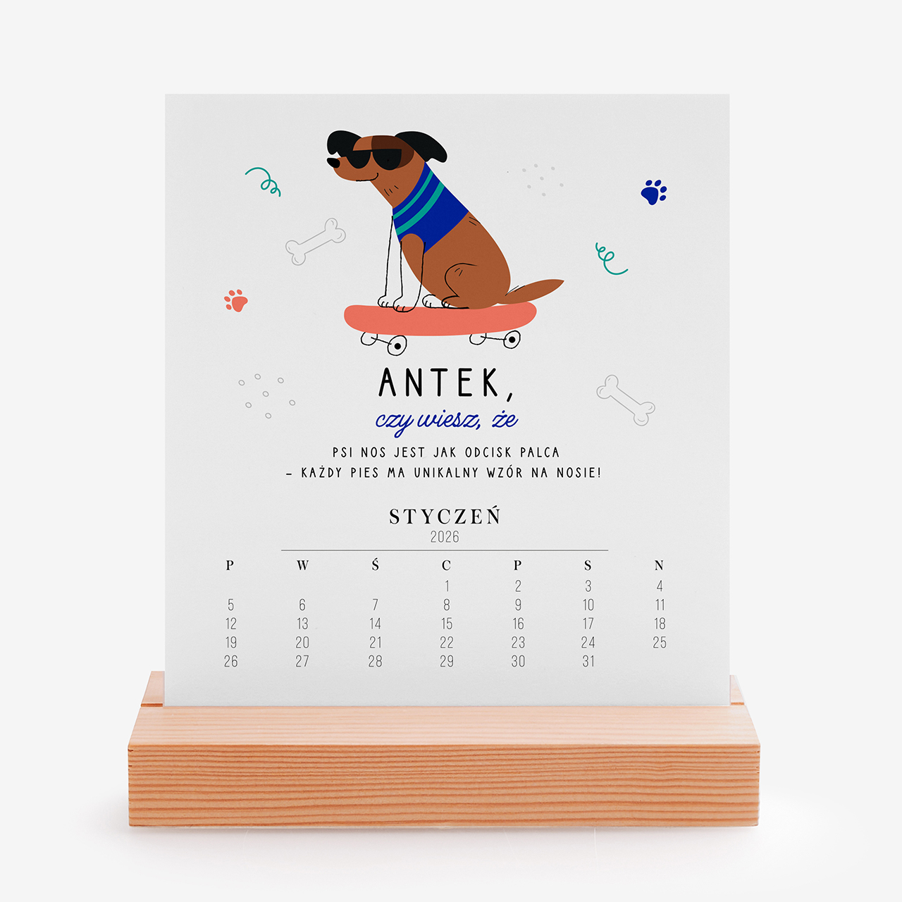 - kalendarz biurkowy z personalizowanym kalendarium na drewnianej podstawce