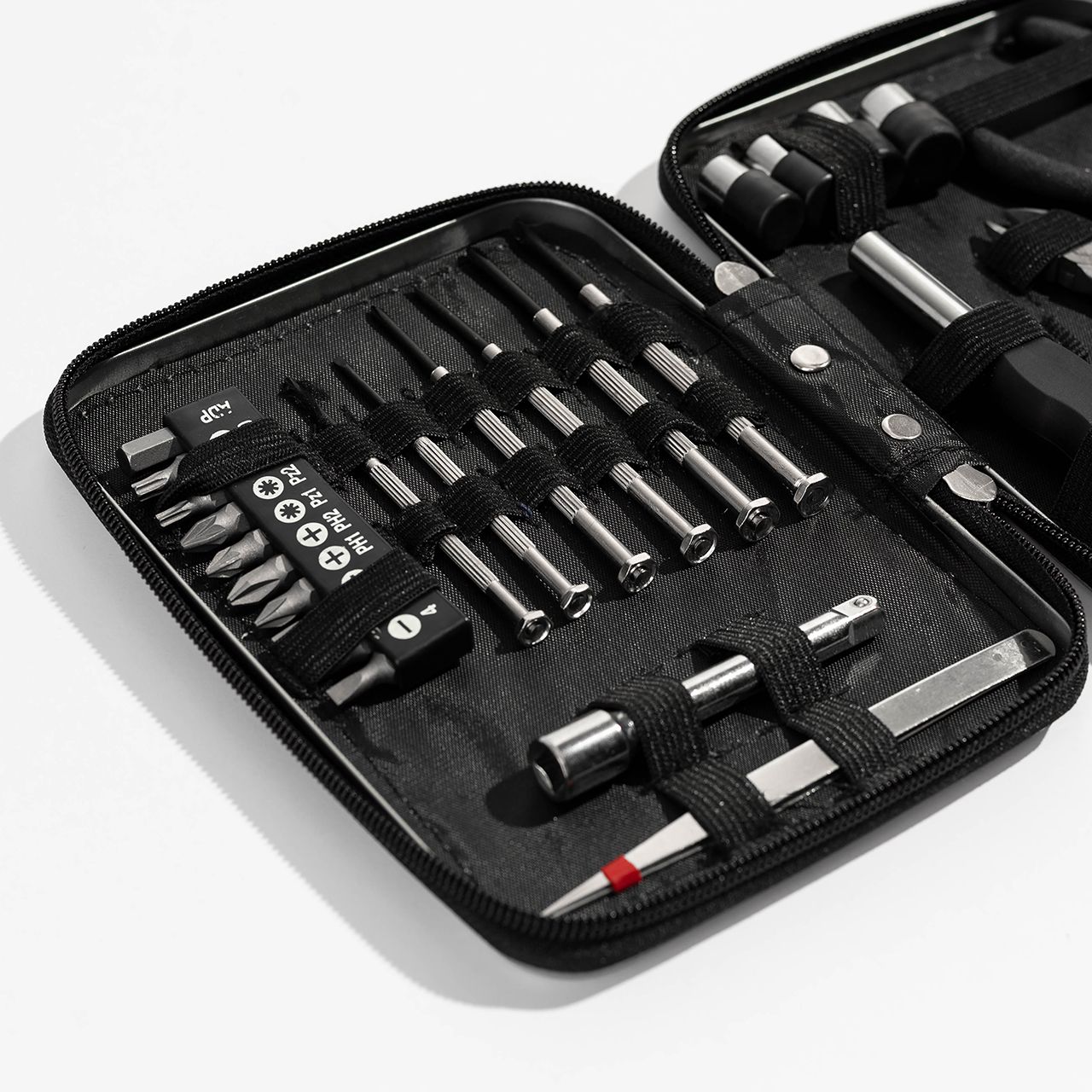 • w skład zestawu wchodzą: kombinerki (1szt.), szczypce boczne (1szt.), pęseta (1szt.), uchwyt do kluczy (1szt.), adapter do kluczy nasadowych (1szt.), przedłużka do kluczy nasadowych (1szt.), komplet nasadek (4szt.), komplet bitów (9szt.), zestaw śrubokrętów precyzyjnych (6szt.)