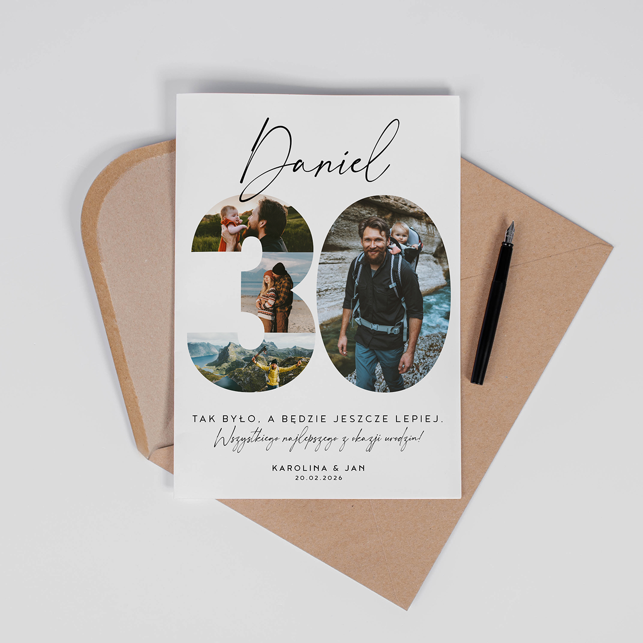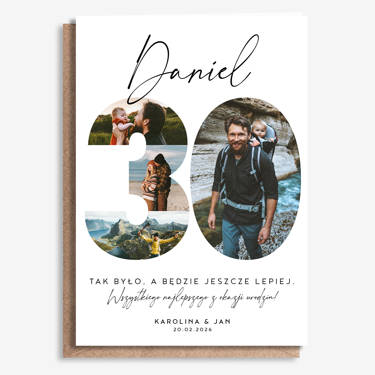 - kartka personalizowana A4 - na pierwszej stronie możliwość umieszczenia własnego tekstu, wewnątrz miejsce na treść życzeń oraz zdjęcie