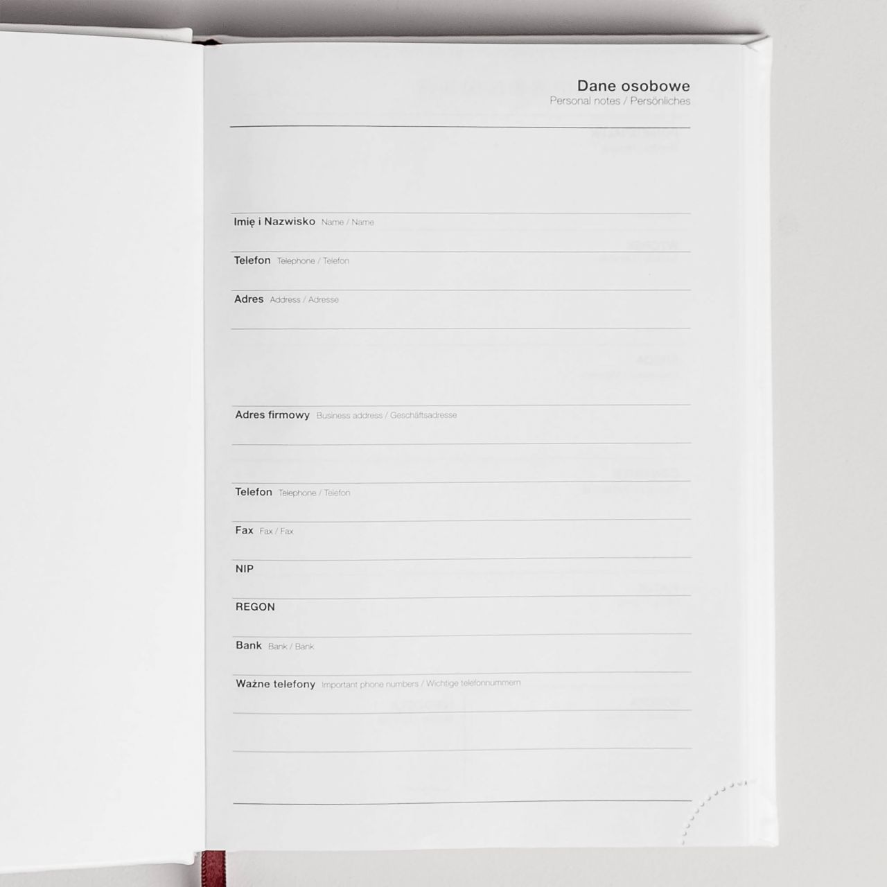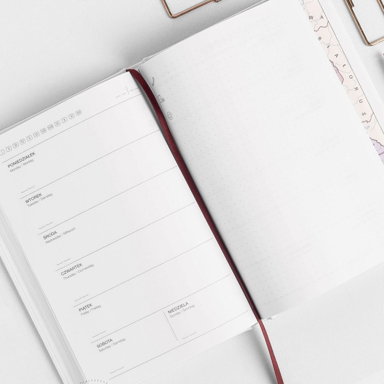 - kalendarz całoroczny z polami do samodzielnego wpisania dat (dzięki temu sam decydujesz od którego dnia rozpoczniesz planowanie)