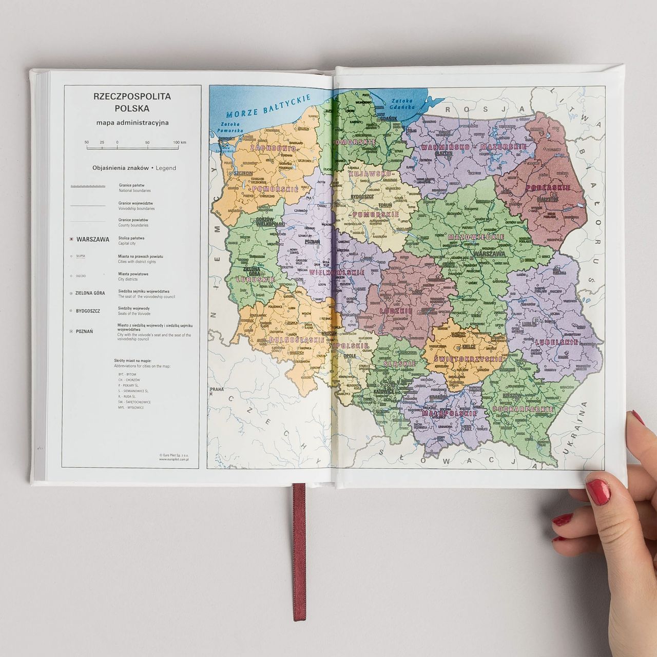 - wewnątrz wiele przydatnych informacji takich jak: numery kierunkowe do różnych krajów na świecie, instrukcja obliczania czasu strefowego wraz z mapą świata, mapa administracyjna Polski, adresy Instytucji Państwowych oraz Polskich Ambasad w Europie i wiele innych