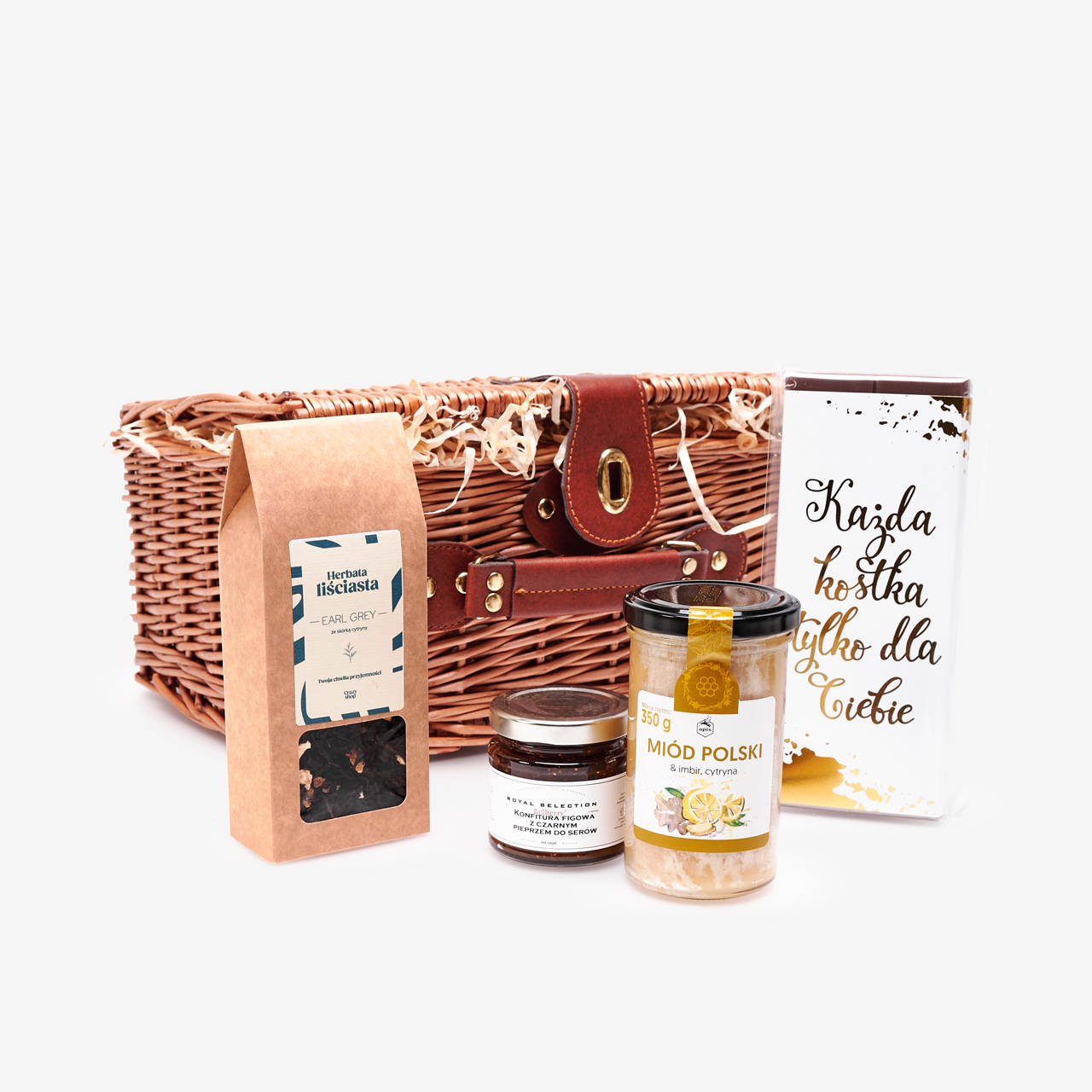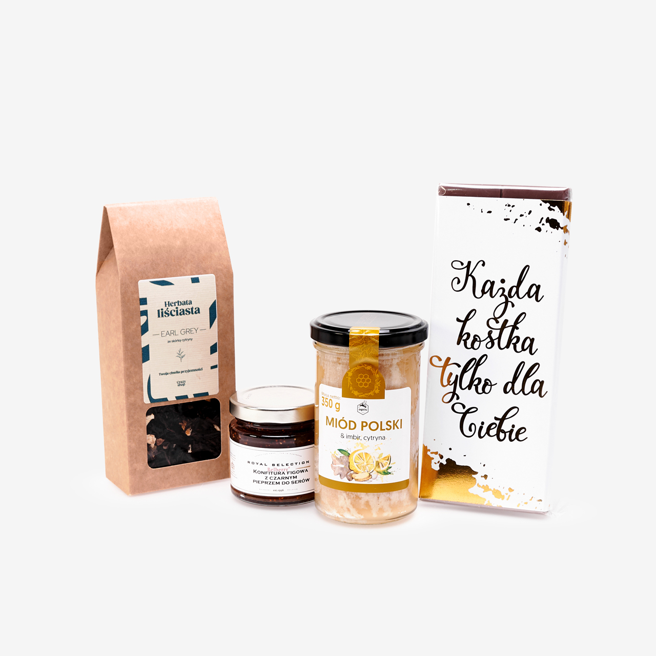 W skład zestawu wchodzą: miód, herbata, czekolada oraz konfitura