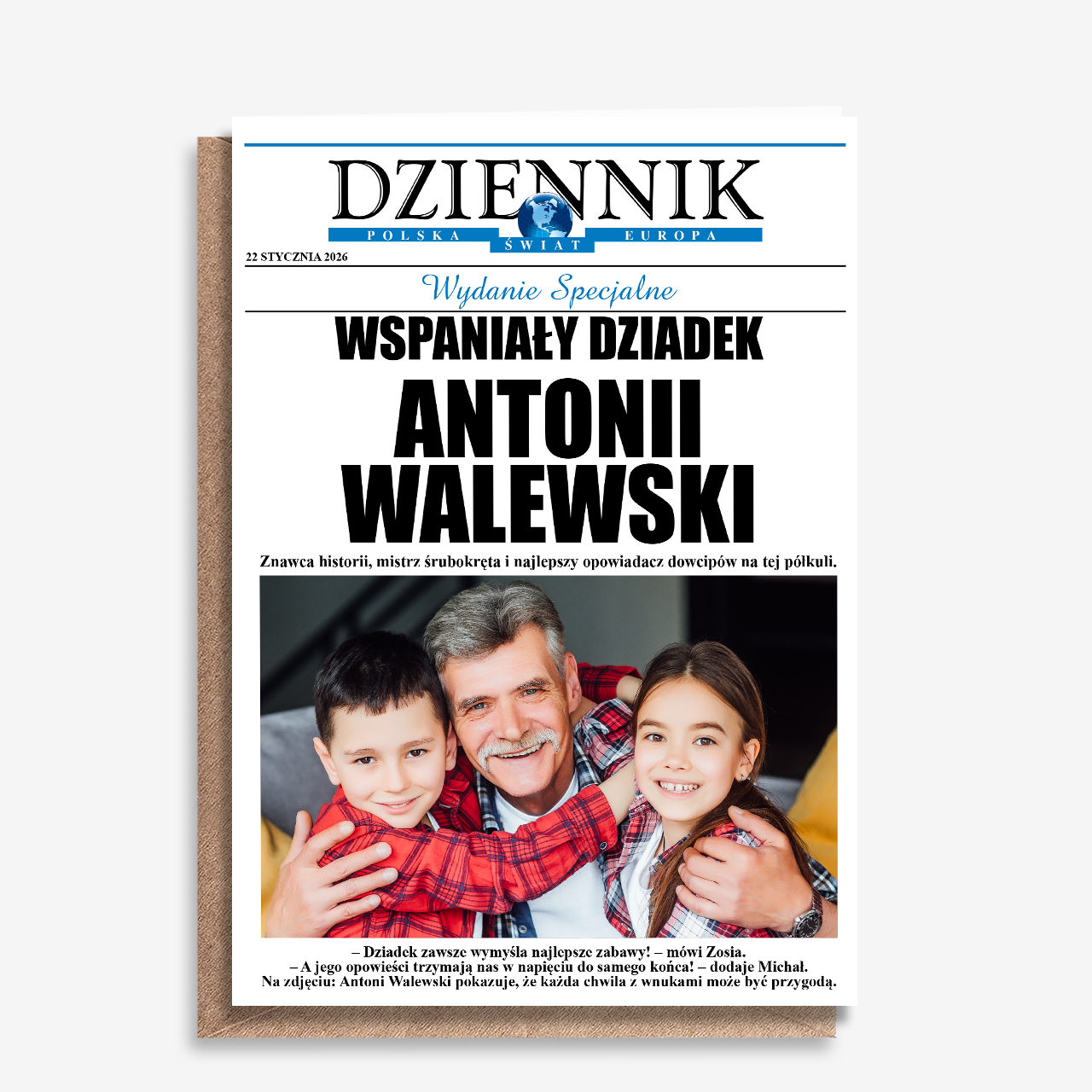 Kartka dla dziadka to oryginalna propozycja, która już od pierwszego spojrzenia wywołuje emocje i uśmiech. Stylizowana na pierwszą stronę gazety forma sprawia, że prezent wyróżnia się na tle klasycznych kartek i zostaje w pamięci na długo. Personalizowane zdjęcie oraz nagłówki nadają całości osobisty charakter, dzięki czemu kartka staje się nie tylko dodatkiem, ale pełnoprawną pamiątką. To doskonały wybór dla osób, które chcą wręczyć prezent dla dziadka w wyjątkowej i przemyślanej formie.