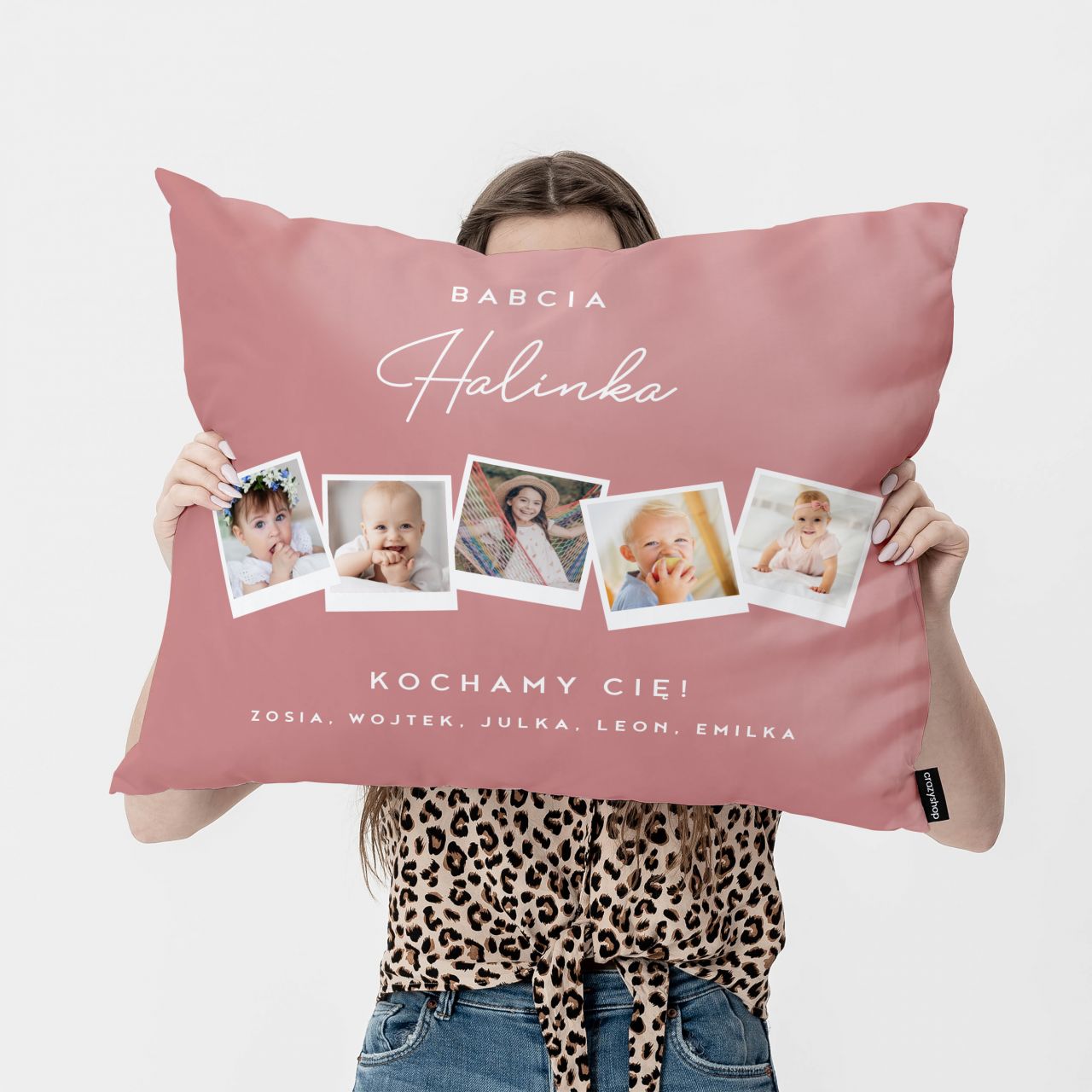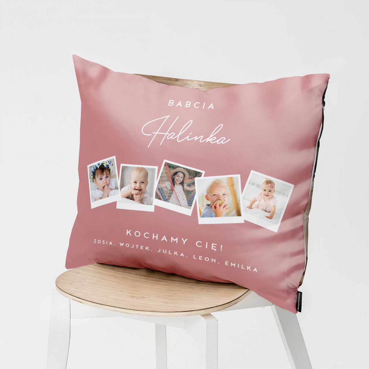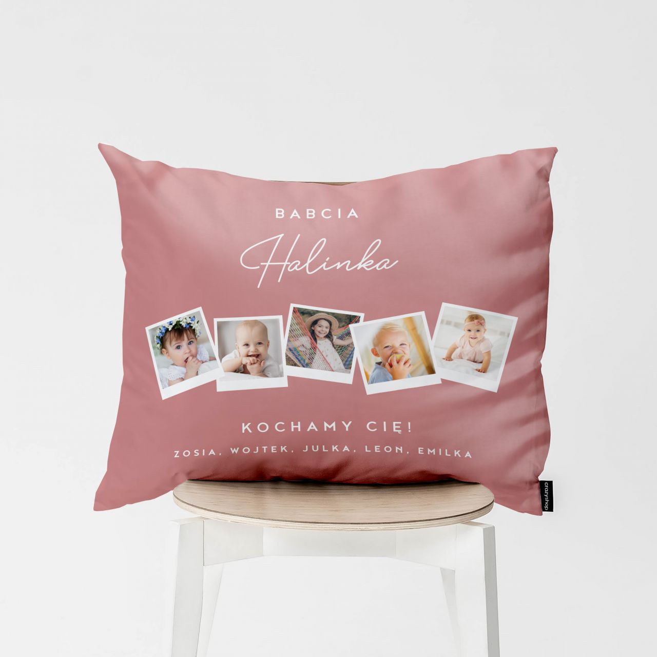 Poduszka ze zdjęciami dla babci PREZENT OD WNUKÓW to wyjątkowy upominek, który łączy domowy komfort z głębokim, emocjonalnym przekazem. Delikatna kolorystyka oraz możliwość umieszczenia kilku zdjęć sprawiają, że poduszka staje się osobistą pamiątką pełną wspomnień. Widok wnuków na co dzień przypomina o bliskości i rodzinnych więziach, nawet gdy nie wszyscy są obok. To doskonały wybór dla osób, które chcą podarować prezent dla babci ciepły, wzruszający i bardzo osobisty.