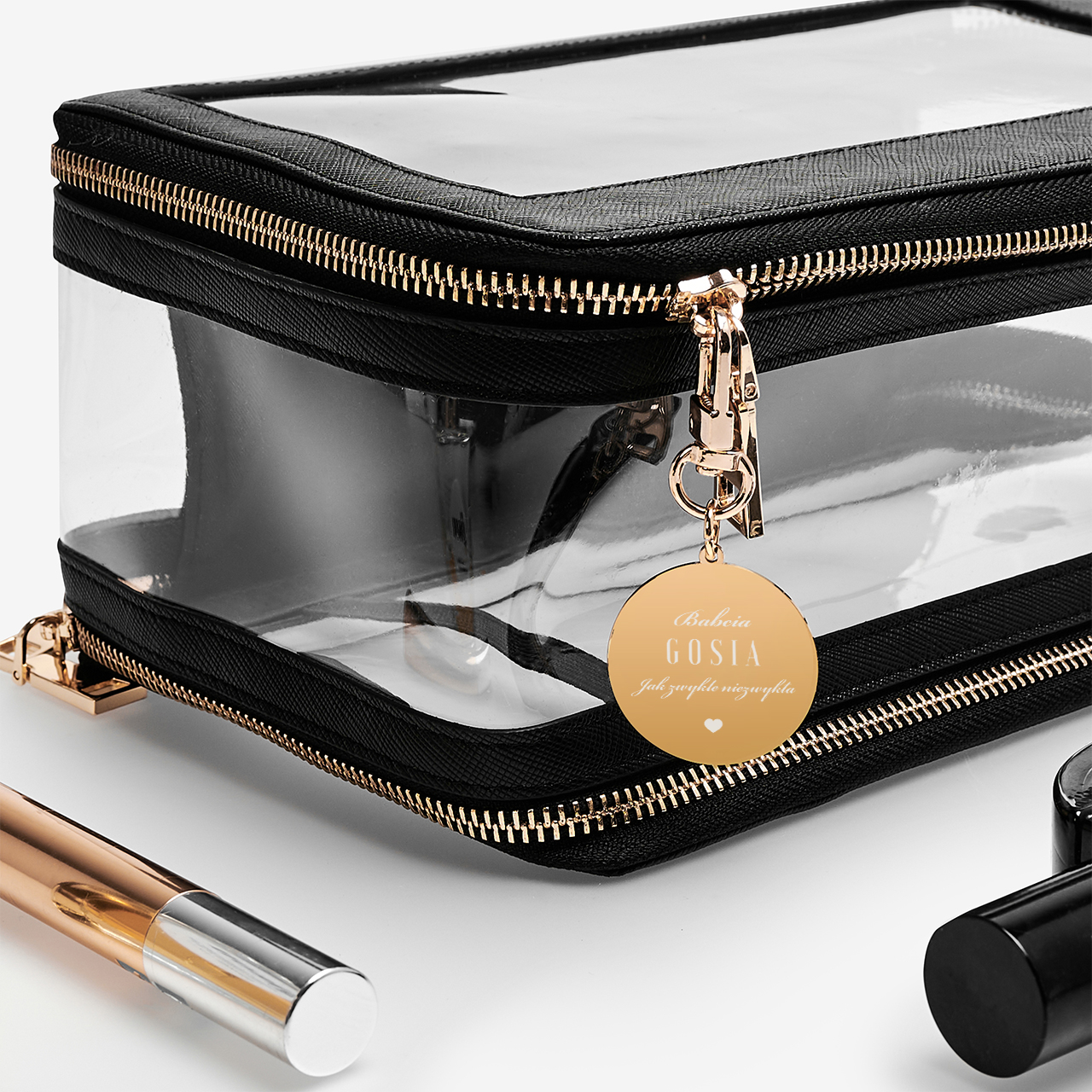 - do kosmetyczki dołączony stylowy, metalowy brelok o średnicy 3,5 cm