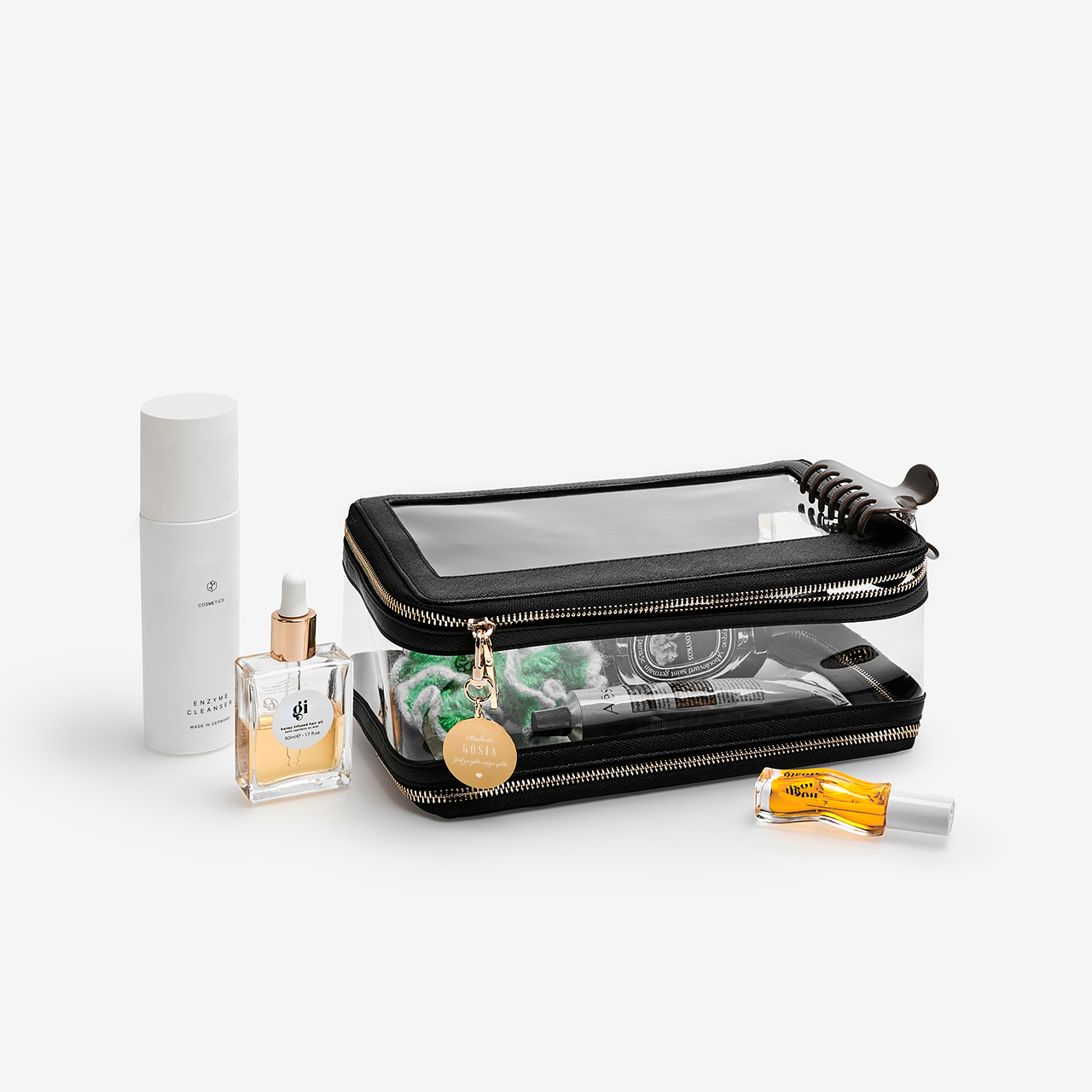 - kosmetyczka wykonana z wysokiej jakości skóry saffiano z transparentnymi ścianami