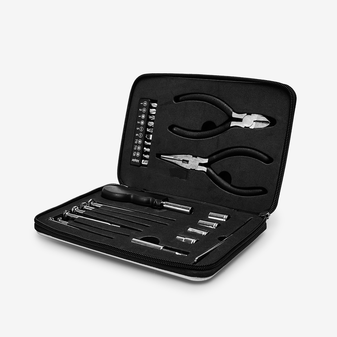 - w skład zestawu wchodzą: kombinerki (1szt.), szczypce boczne (1szt.), pęseta (1szt.), uchwyt do kluczy (1szt.), adapter do kluczy nasadowych (1szt.), przedłużka do kluczy nasadowych (1szt.), komplet nasadek (4szt.), komplet bitów (9szt.), zestaw śrubokrętów precyzyjnych (6szt.)
