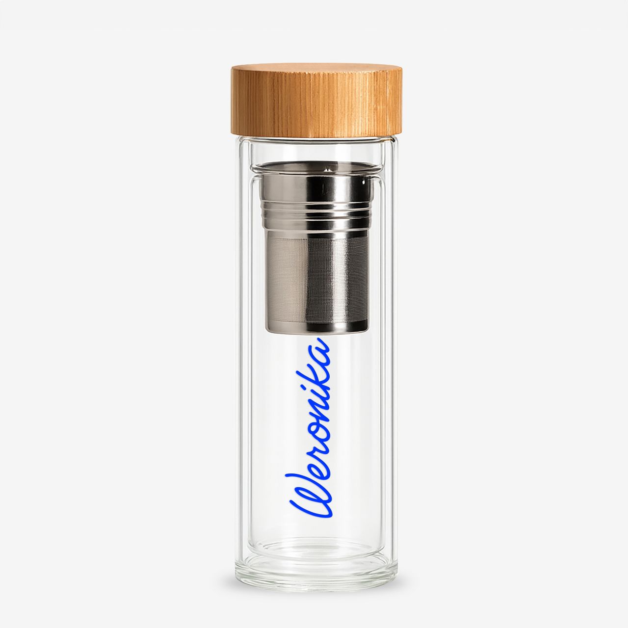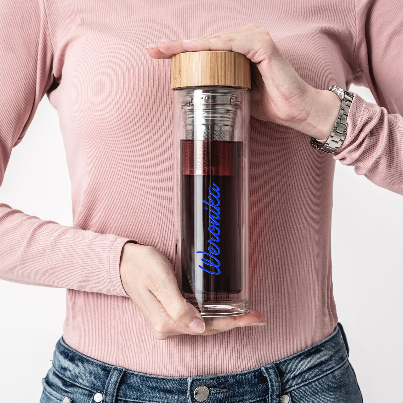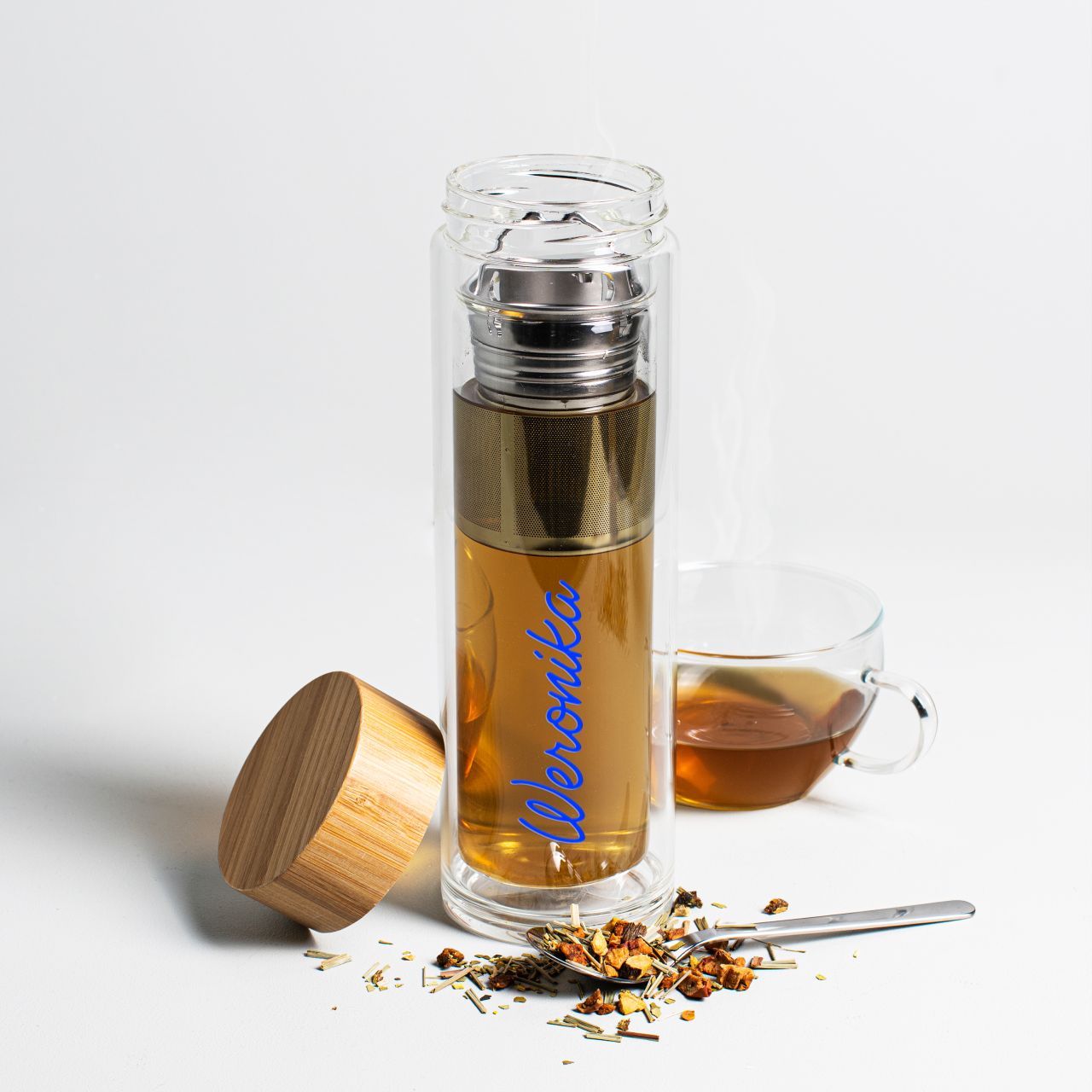 • szklana butelka z zaparzaczem do herbaty ze stali nierdzewnej i z bambusową zakrętką