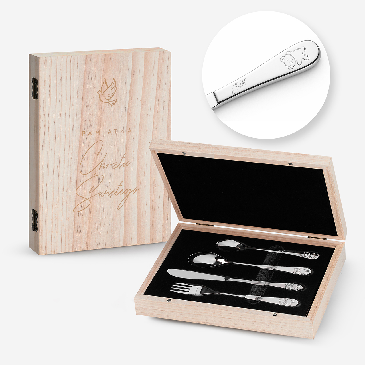 - całość zapakowane w pudełko wykonane z drewna sosnowego zamykanego na dwa magnesy z wygrawerownym wzorem (brak możliwości zmiany)