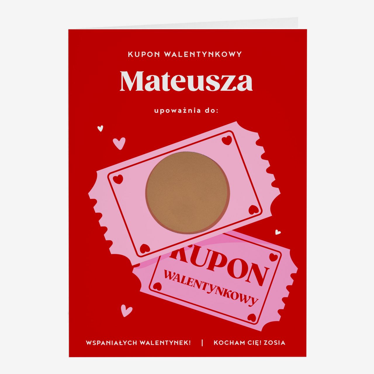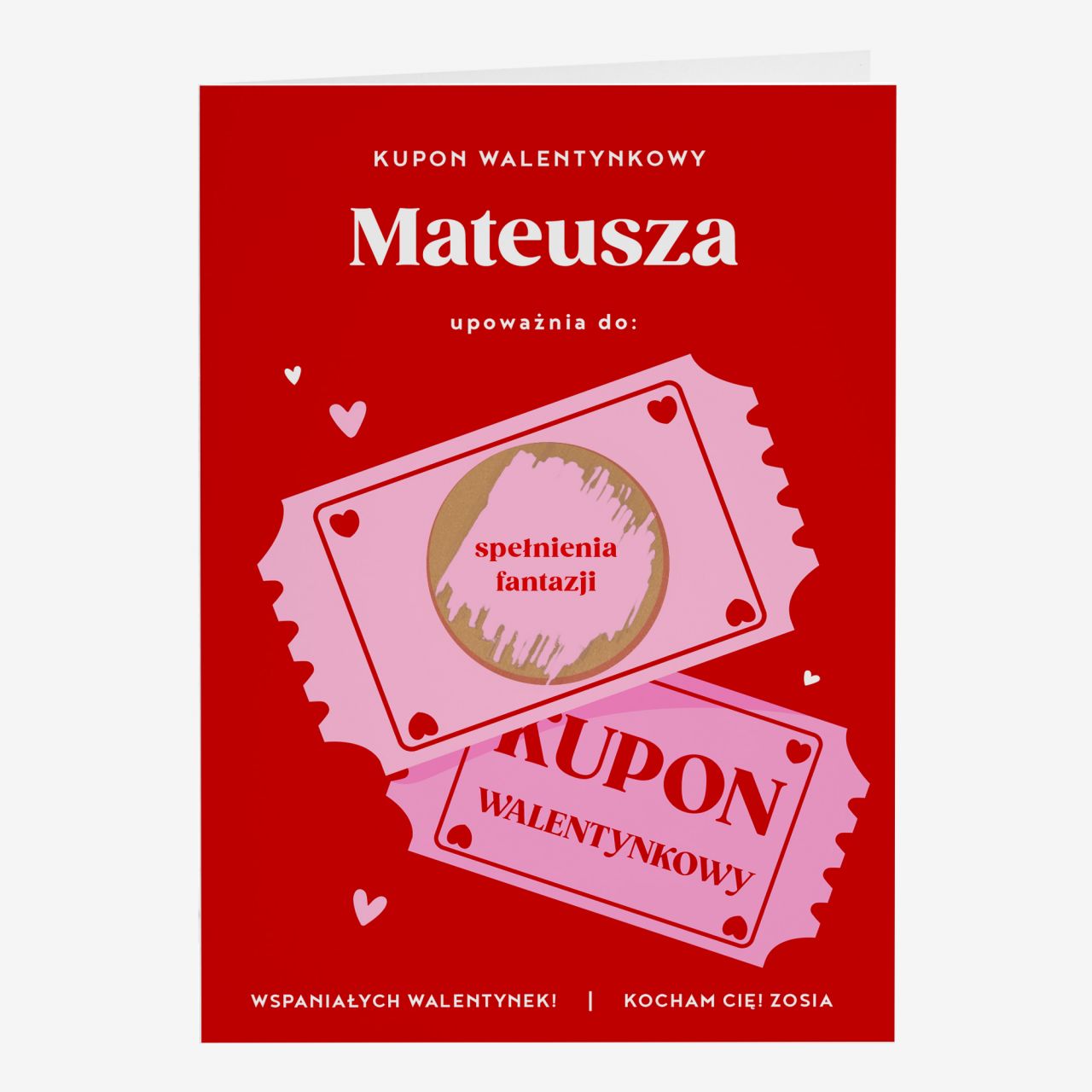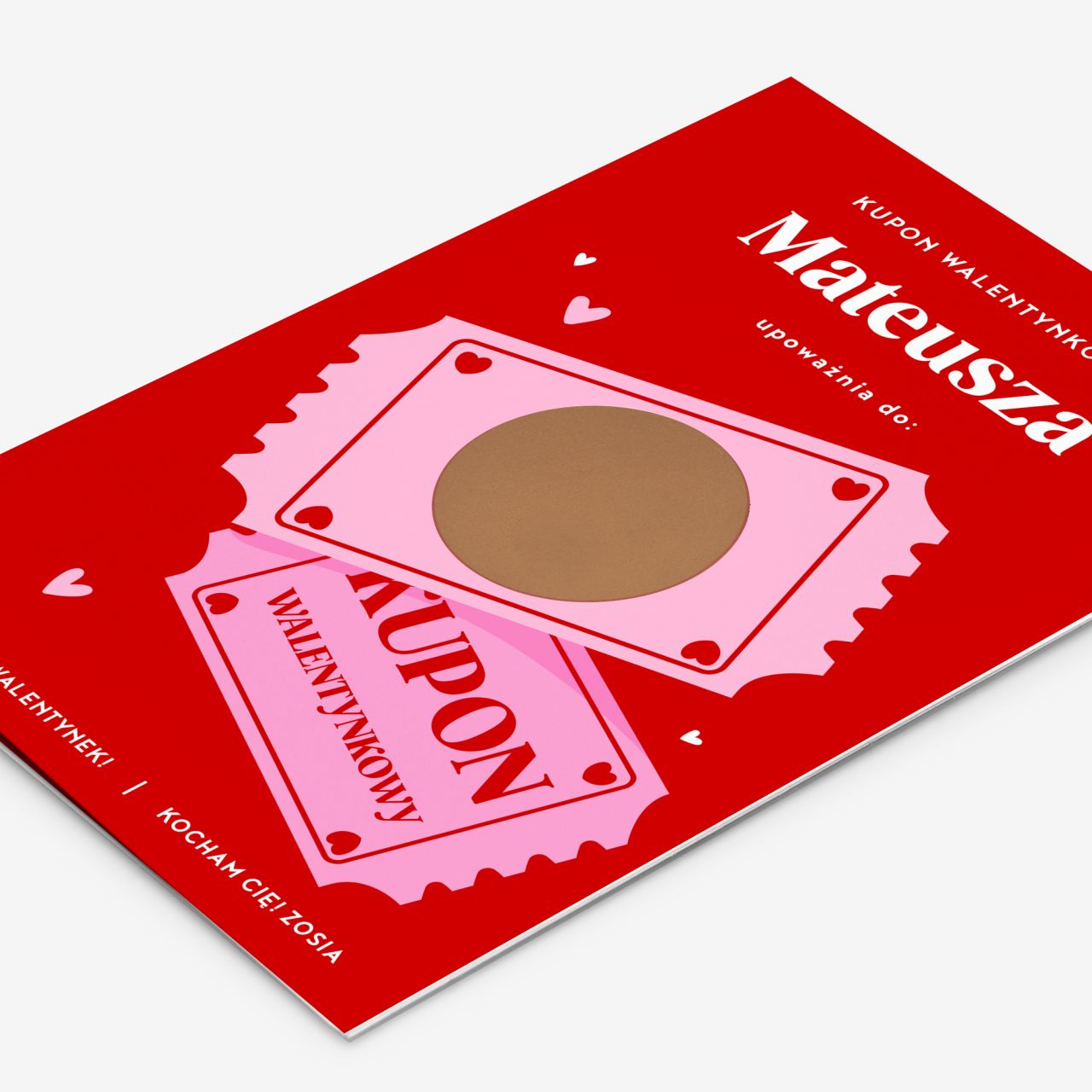 Personalizowana kartka zdrapka została stworzona dla osób, które chcą przekazać emocje w nietypowej, ale czytelnej formie. Zdrapywana powierzchnia kryje treść, która może być romantyczna, zabawna lub symboliczna, dzięki czemu kartka nabiera osobistego znaczenia. To doskonałe rozwiązanie, gdy zależy Ci na prezencie, który wywoła uśmiech i zapadnie w pamięć. Taki kupon może stać się zapowiedzią wspólnego czasu lub drobnej niespodzianki.
