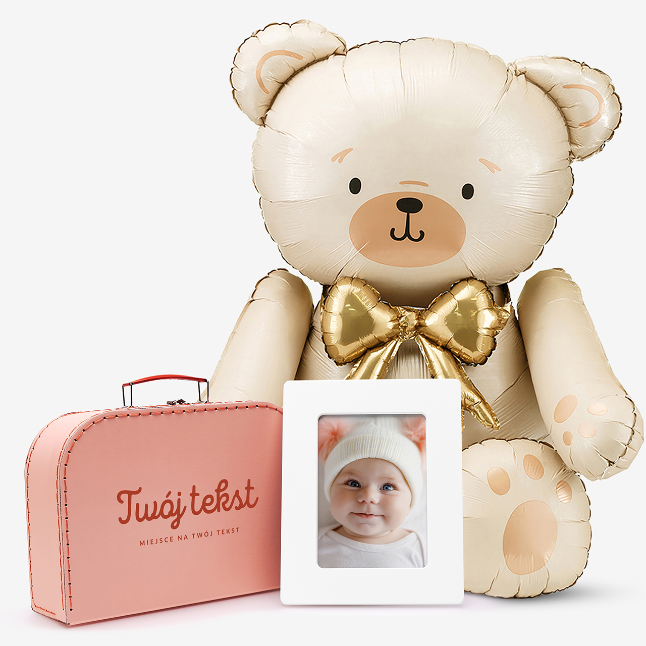 Kuferek z balonem i ramką TWÓJ TEKST prezent na narodziny dziecka