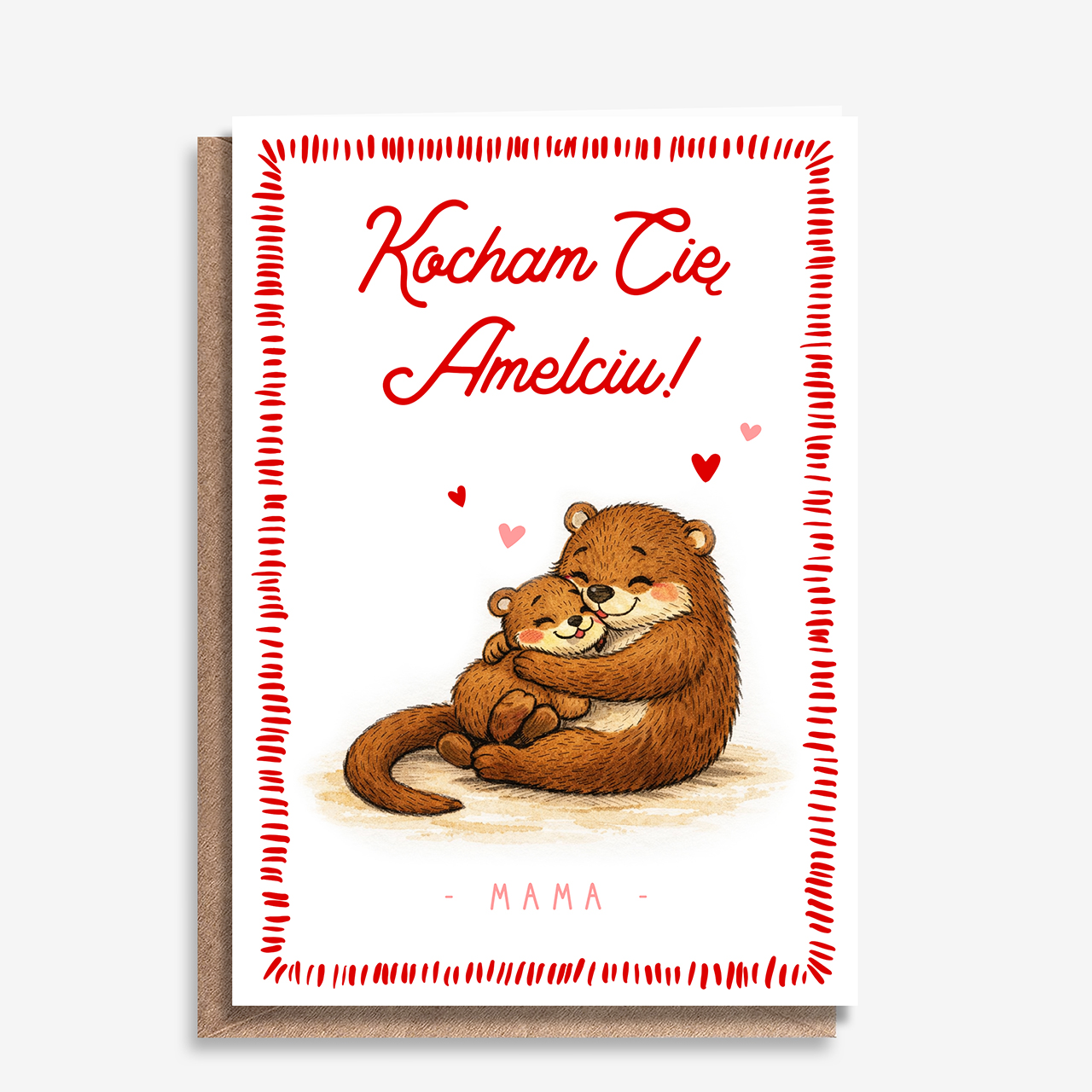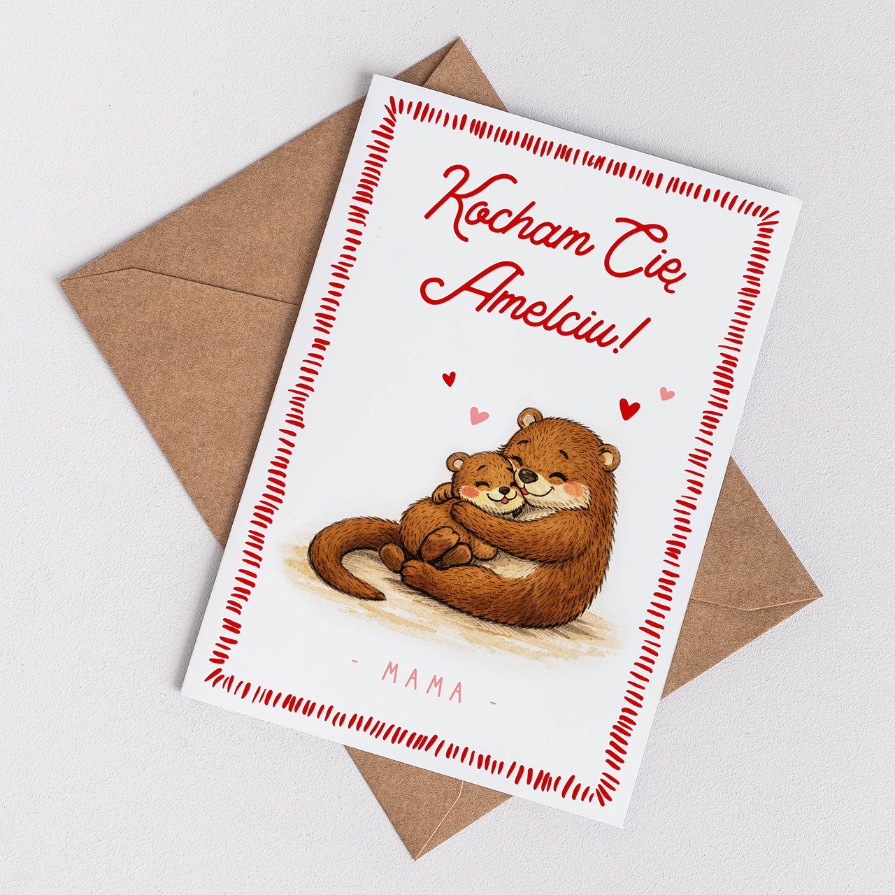Kartka walentynkowa dla dziecka to ciepły i pełen emocji dodatek, który pozwala w prosty sposób wyrazić miłość i bliskość wobec dziecka. Urocza ilustracja przedstawiająca przytulone wydry oraz delikatna kolorystyka sprawiają, że kartka ma wyjątkowo przyjazny i rodzinny charakter. To idealny wybór na Walentynki, ale także jako symboliczny gest miłości bez okazji. Kartka walentynkowa dla dziecka doskonale uzupełni prezent lub może być samodzielnym upominkiem.