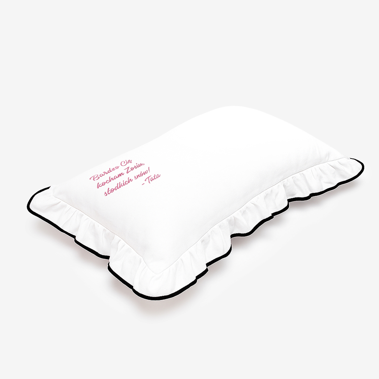 Poduszka z falbanką to wyjątkowo delikatny i pełen emocji upominek, który łączy estetykę z osobistym przekazem. Klasyczna biała poduszka została ozdobiona subtelną falbanką, która nadaje jej lekkości i dziewczęcego uroku. Haftowany napis umieszczony na poszewce sprawia, że produkt staje się osobistą pamiątką, idealną do dziecięcej sypialni. To dodatek, który nie tylko zdobi wnętrze, ale również buduje poczucie bliskości i bezpieczeństwa.