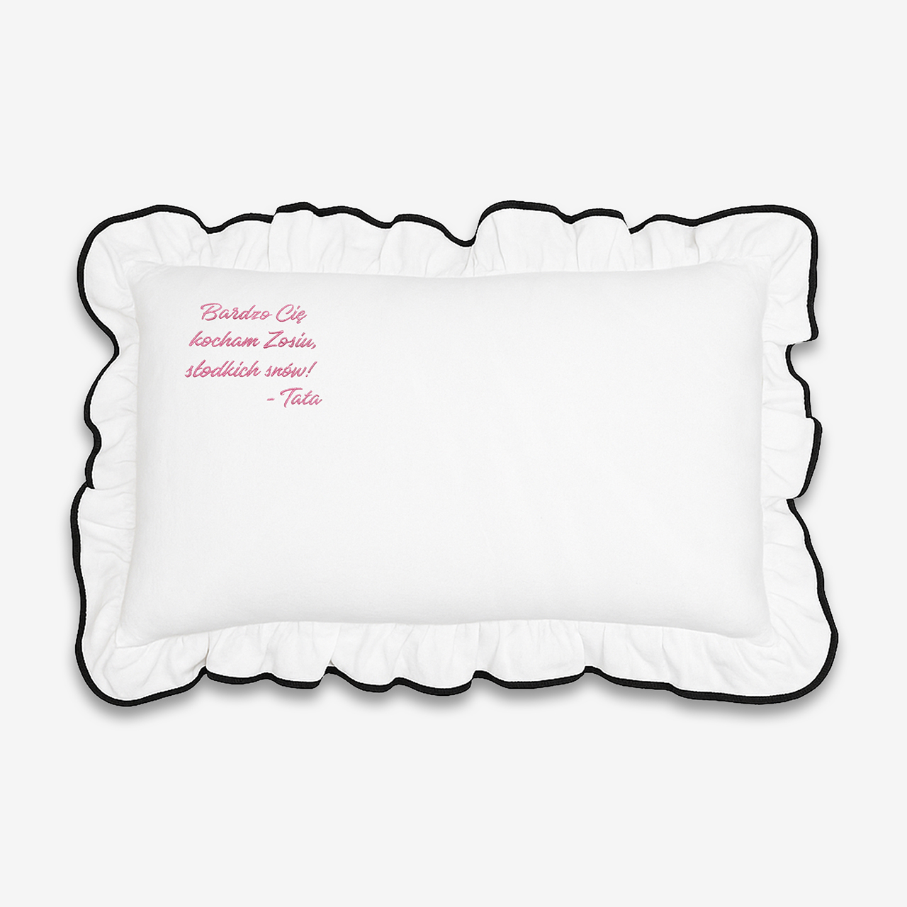 Poduszka z falbanką doskonale sprawdzi się jako upominek na urodziny, święta, Dzień Dziecka lub jako symboliczny prezent bez okazji. Miękka forma i jasna kolorystyka sprawiają, że poduszka dobrze komponuje się z różnymi aranżacjami wnętrz. Haft jest subtelny, ale czytelny, dzięki czemu przekaz pozostaje wyraźny i wzruszający. To prezent dla córki, który łączy funkcję użytkową z wartością emocjonalną.