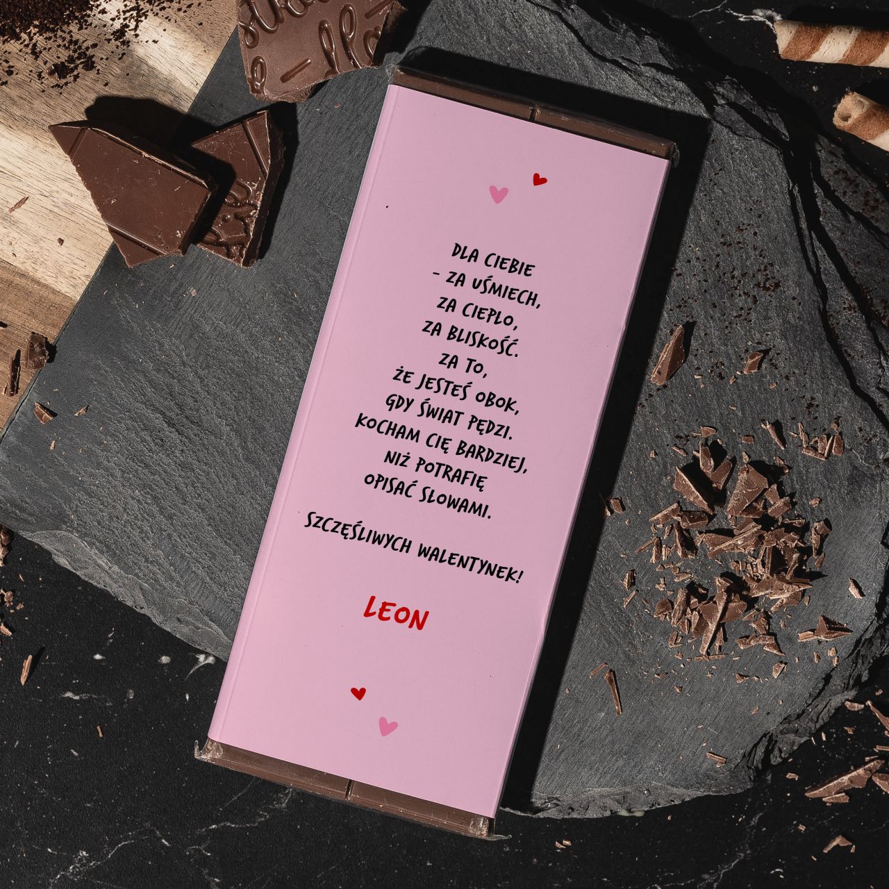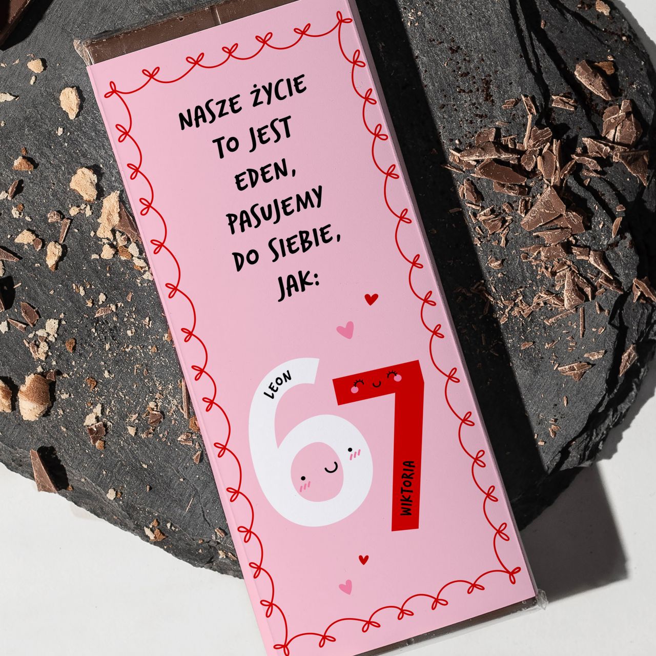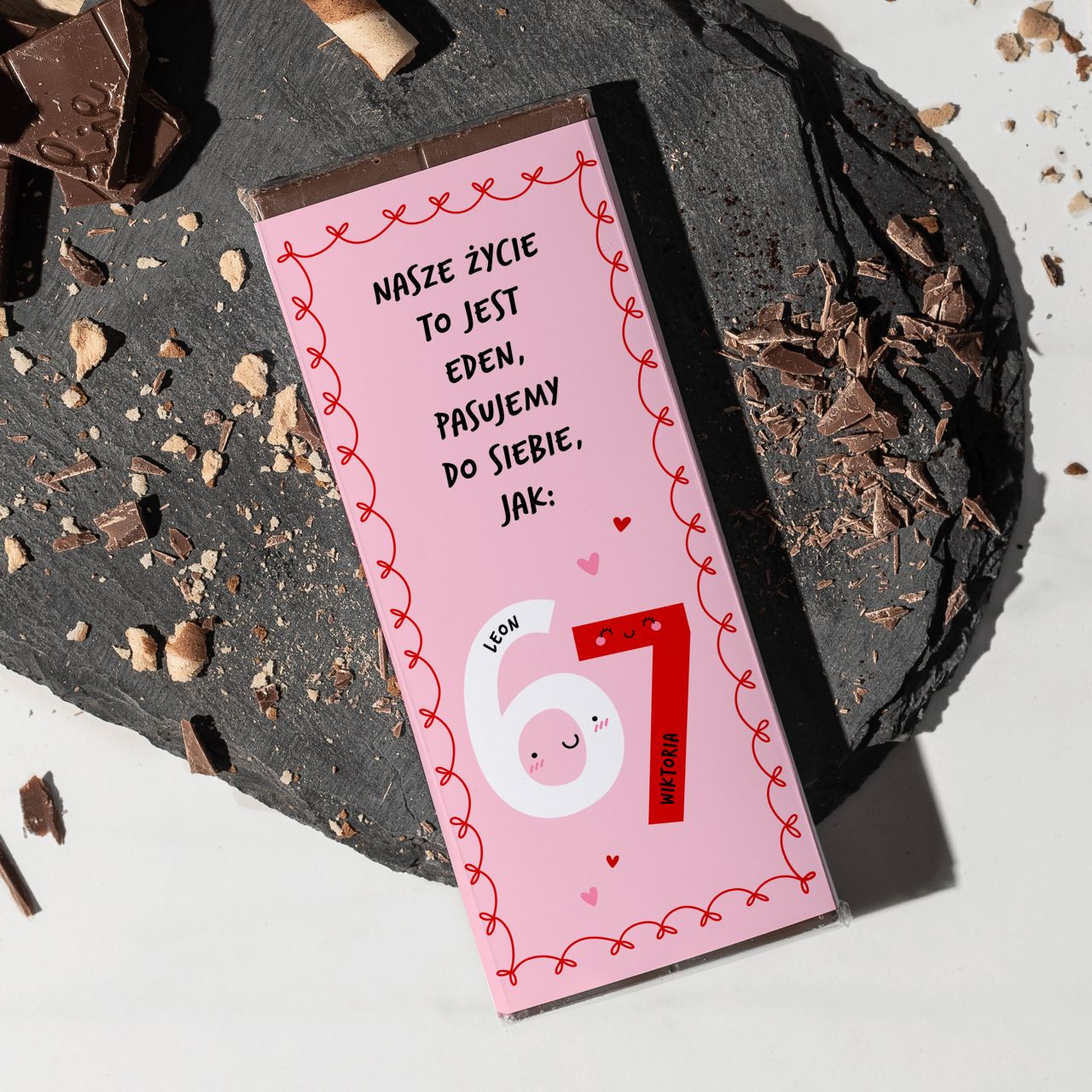 Personalizowana czekolada to słodki i symboliczny sposób na wyrażenie uczuć w wyjątkowym stylu. Projekt z liczbą 6 i 7, które idealnie do siebie pasują, podkreśla więź między dwojgiem ludzi. Delikatna, różowa grafika z serduszkami nadaje całości romantyczny charakter. To personalizowana czekolada, która łączy smak, estetykę i osobisty przekaz w jednym prezencie.