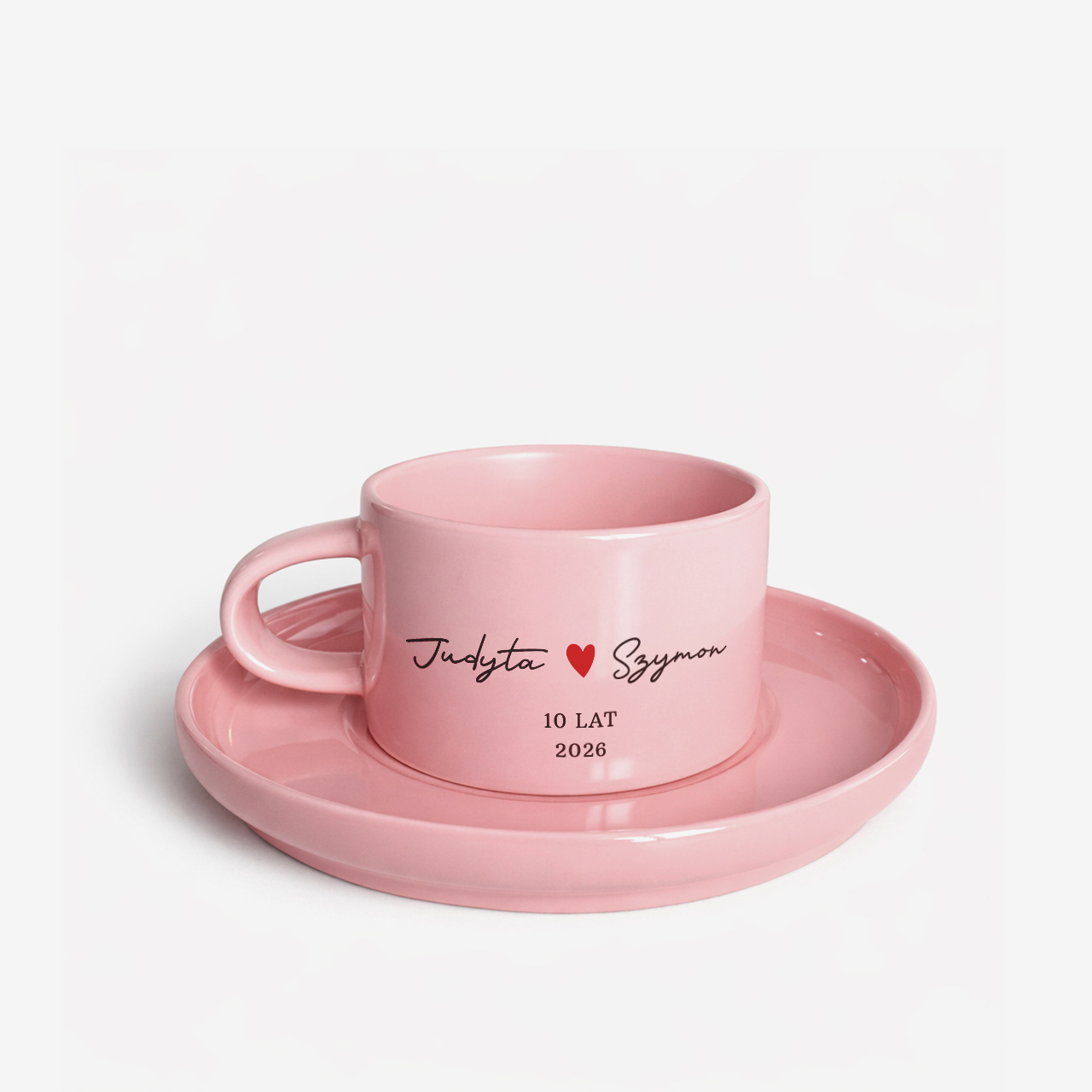 Filiżanka personalizowana z talerzykiem PREZENT NA ROCZNICĘ ŚLUBU łączy estetykę z osobistym przekazem. Filiżanka różowa podkreśla wyjątkowy charakter chwili i tworzy piękną oprawę przy wspólnej kawie. Taka personalizowana filiżanka do kawy może stać się stałym elementem codziennych rytuałów. Różowa filiżanka ze spodkiem to idealny wybór jako elegancki prezent na 10 rocznicę ślubu lub inny ważny jubileusz.