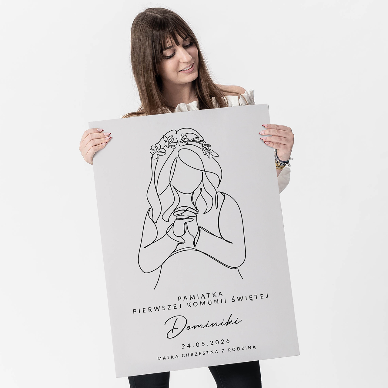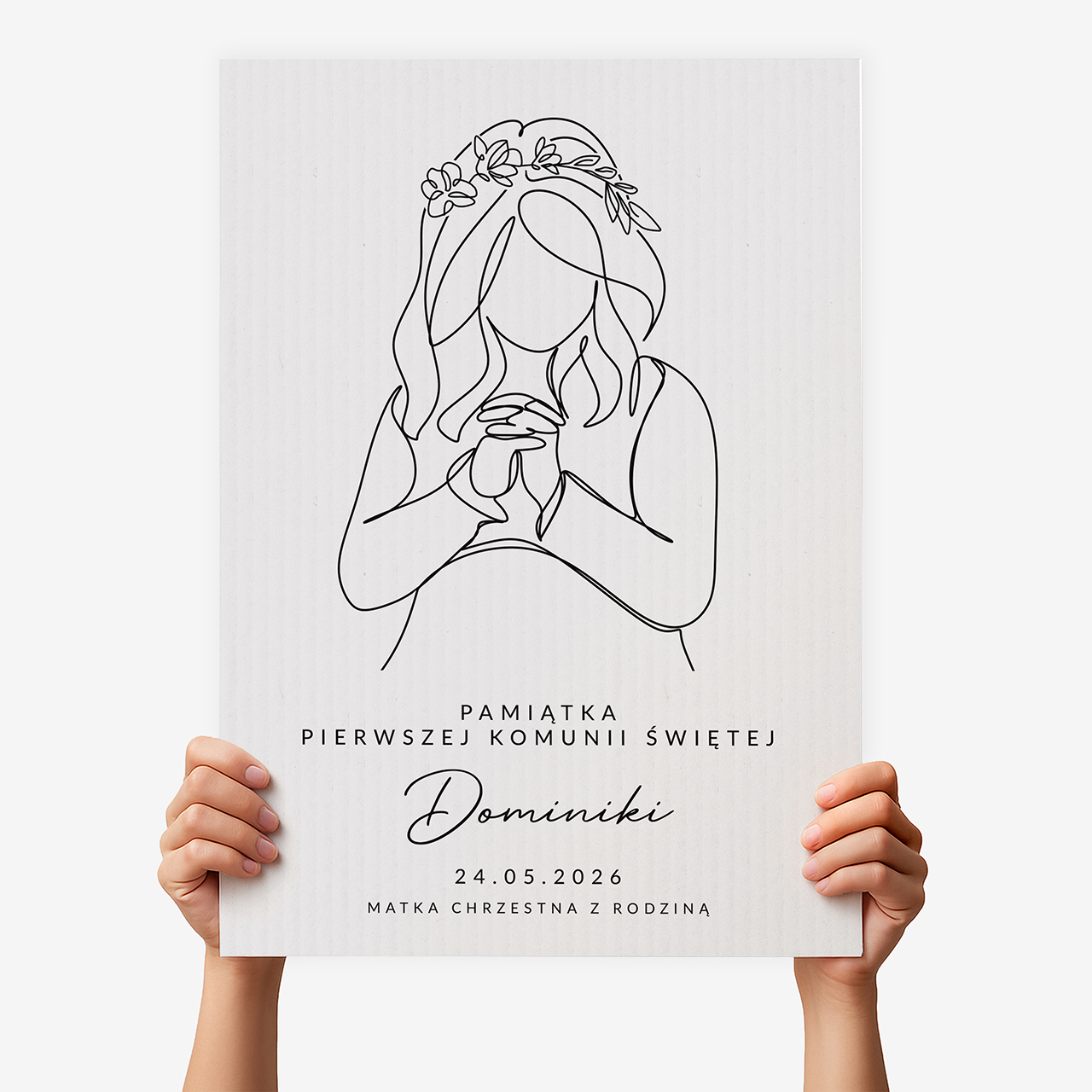 Pierwsza Komunia Święta to wydarzenie pełne emocji, duchowego znaczenia i rodzinnych spotkań. Warto podarować dziecku coś, co stanie się trwałą pamiątką tego ważnego dnia. Minimalistyczna ilustracja modlącej się dziewczynki oraz elegancki układ typografii nadają całości wyjątkowego charakteru. Dzięki temu Kartka XXL na Pamiątkę Pierwszej Komunii Świętej staje się pięknym symbolem wspomnień i wyjątkowym dodatkiem do prezentu komunijnego.