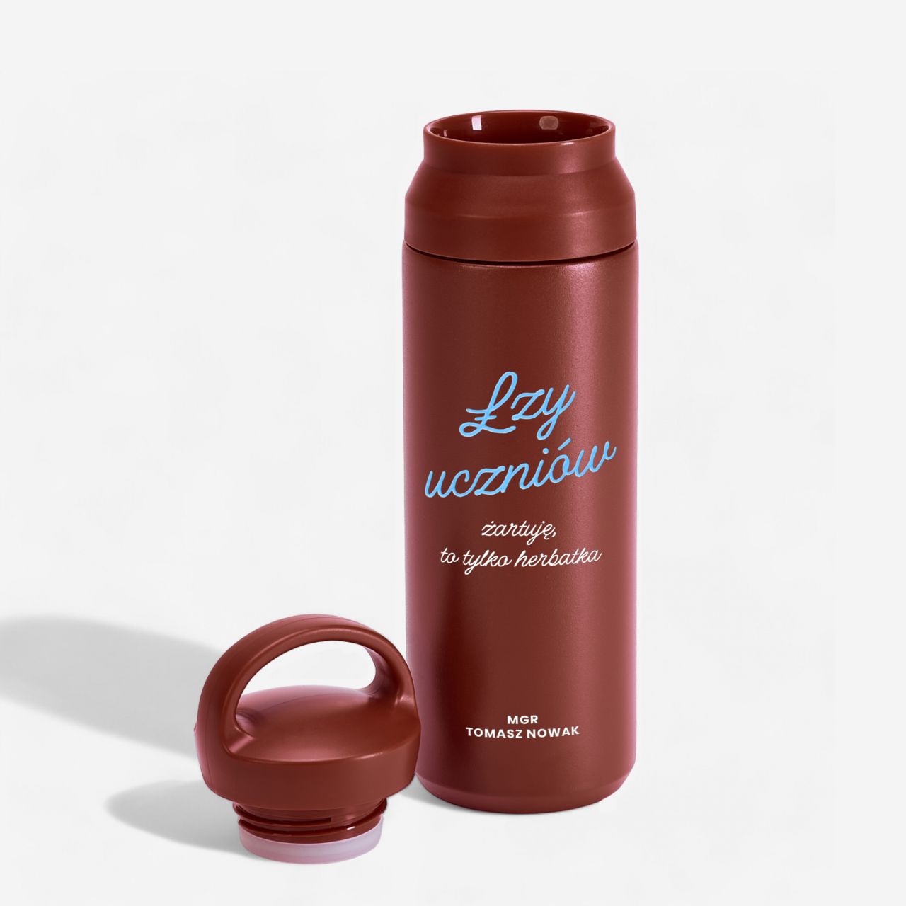 Szukasz prezentu, który będzie jednocześnie praktyczny i z przymrużeniem oka? Ten termos od razu przyciąga uwagę zabawnym napisem i nowoczesnym wyglądem. Wygodny uchwyt sprawia, że łatwo zabrać go ze sobą do szkoły, na spacer lub w podróż. Personalizowany termos z uchwytem ŁZY UCZNIÓW to świetny pomysł na prezent personalizowany dla nauczyciela, który łączy funkcjonalność z humorem. Dzięki niemu ulubiona herbata lub kawa zawsze będzie pod ręką i w odpowiedniej temperaturze.