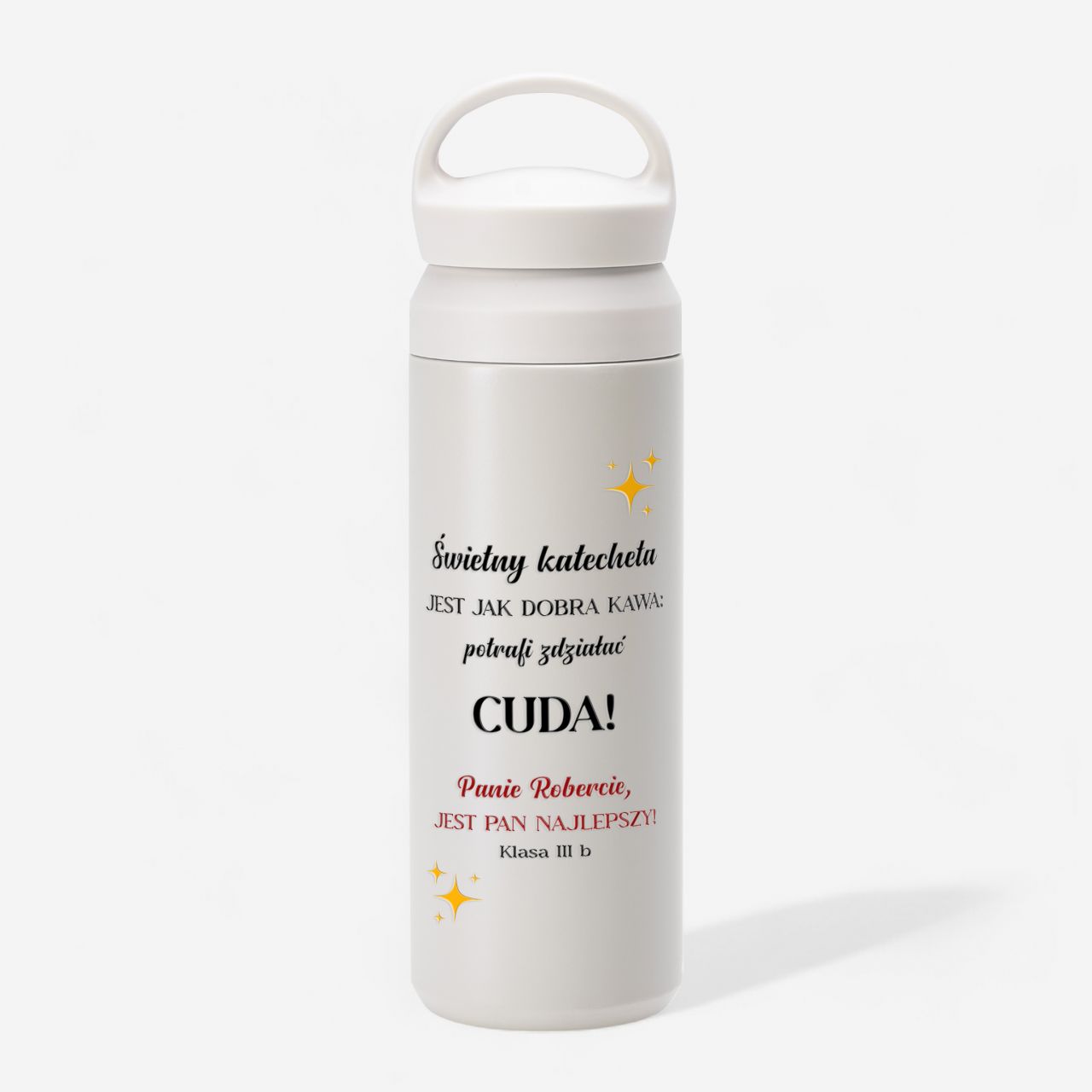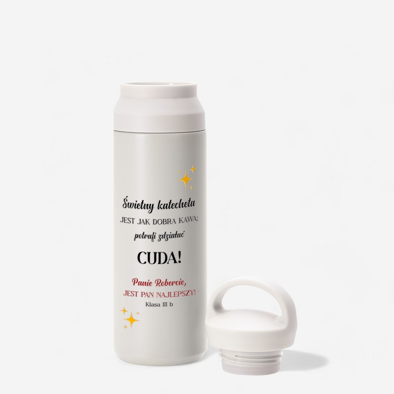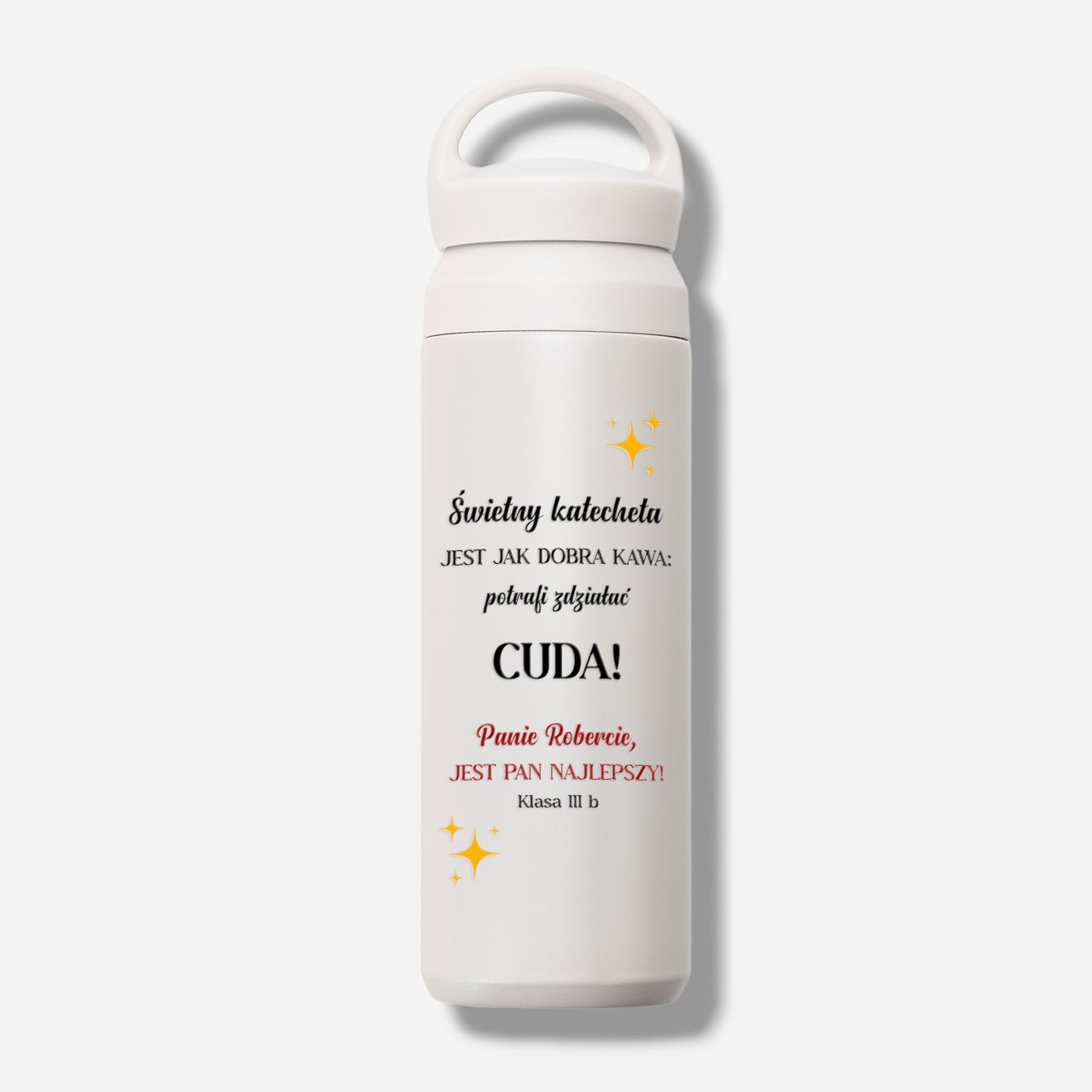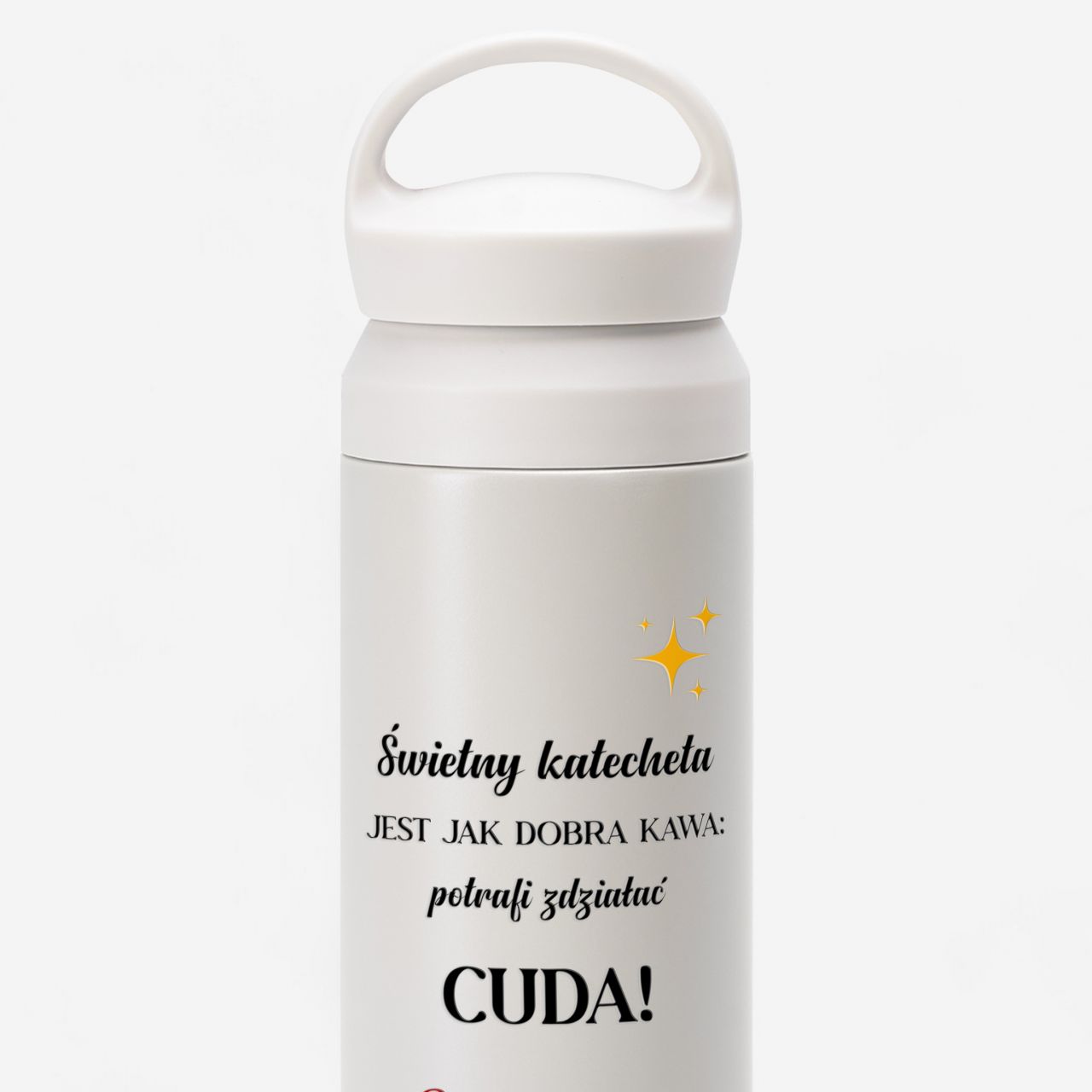 To upominek, który łączy codzienną funkcjonalność z miłym gestem. Termos sprawdzi się zarówno w pracy, jak i poza nią, zapewniając komfort picia ulubionych napojów. Prosty design pasuje do różnych stylów i sytuacji. Termos ŚWIETNY KATECHETA to prezent, który jest praktyczny, a jednocześnie niesie ze sobą pozytywny przekaz. Dzięki temu zostaje z obdarowaną osobą na długo i przypomina o miłym geście.