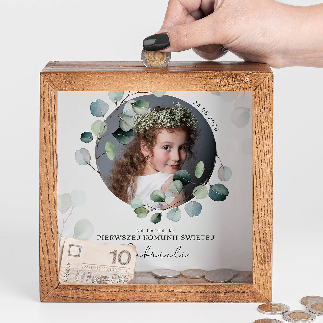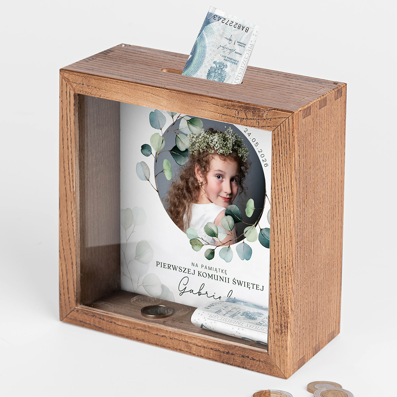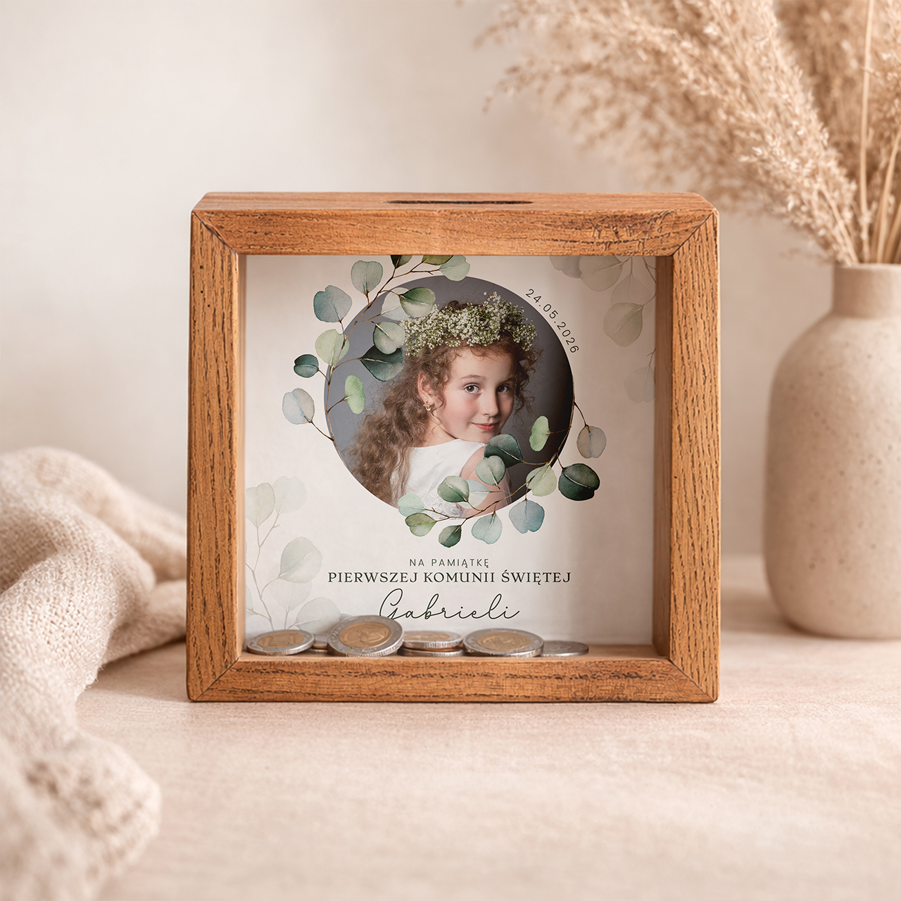 Pierwsza Komunia Święta to wyjątkowa chwila, która zasługuje na piękną i trwałą pamiątkę. Drewniana skarbonka z personalizacją i miejscem na zdjęcie to połączenie elegancji oraz praktyczności. Subtelny motyw roślinny i staranne wykonanie sprawiają, że produkt doskonale wpisuje się w charakter uroczystości. Skarbonka na komunię PREZENT OD CHRZESTNEJ to nie tylko upominek, ale także symbol troski i wsparcia na przyszłość.