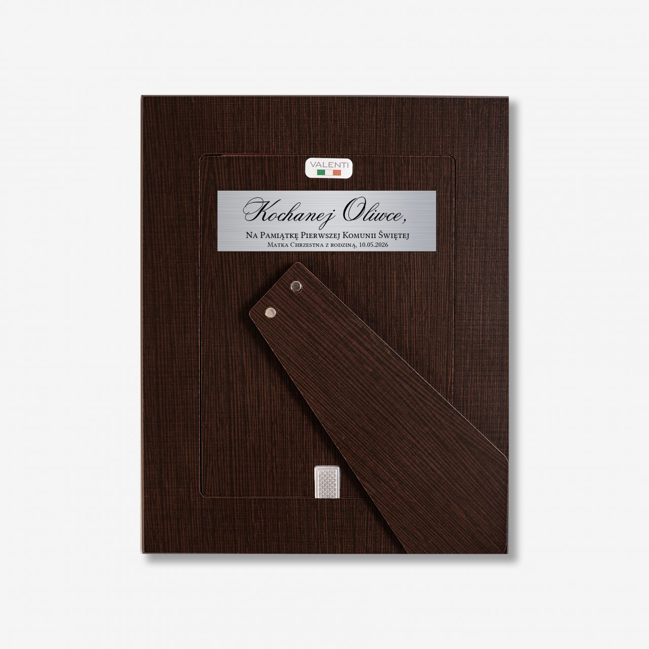 • z tyłu ramki znajduje się aluminiowa tabliczka, na której umieścisz własny tekst w formie wygrawerowanej dedykacji